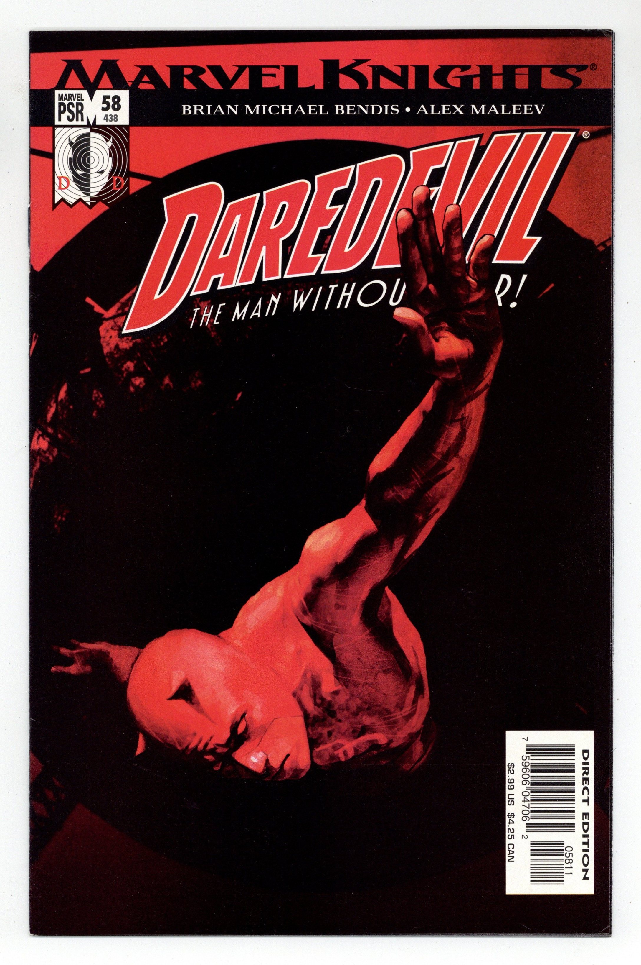 Written by BRIAN MICHAEL BENDIS Cover & pencils by ALEX MALEEV "THE KING OF HELL's KITCHEN" pt. 3 of 5. Matt Murdock is missing after his battle with 100 armed men, and only Ben Urich can find him. Is DD even alive? 32 PGS./MARVEL PSR...$2.99 UPC: 5960604706-05811 ·THIS STORY ARC GUEST-STARS SPIDER-MAN, MR. FANTASTIC, DR. STRANGE & LUKE CAGE! * Look for the DAREDEVIL Vol. 8 TPB in the Graphic Novels Section! Cover price $2.99.