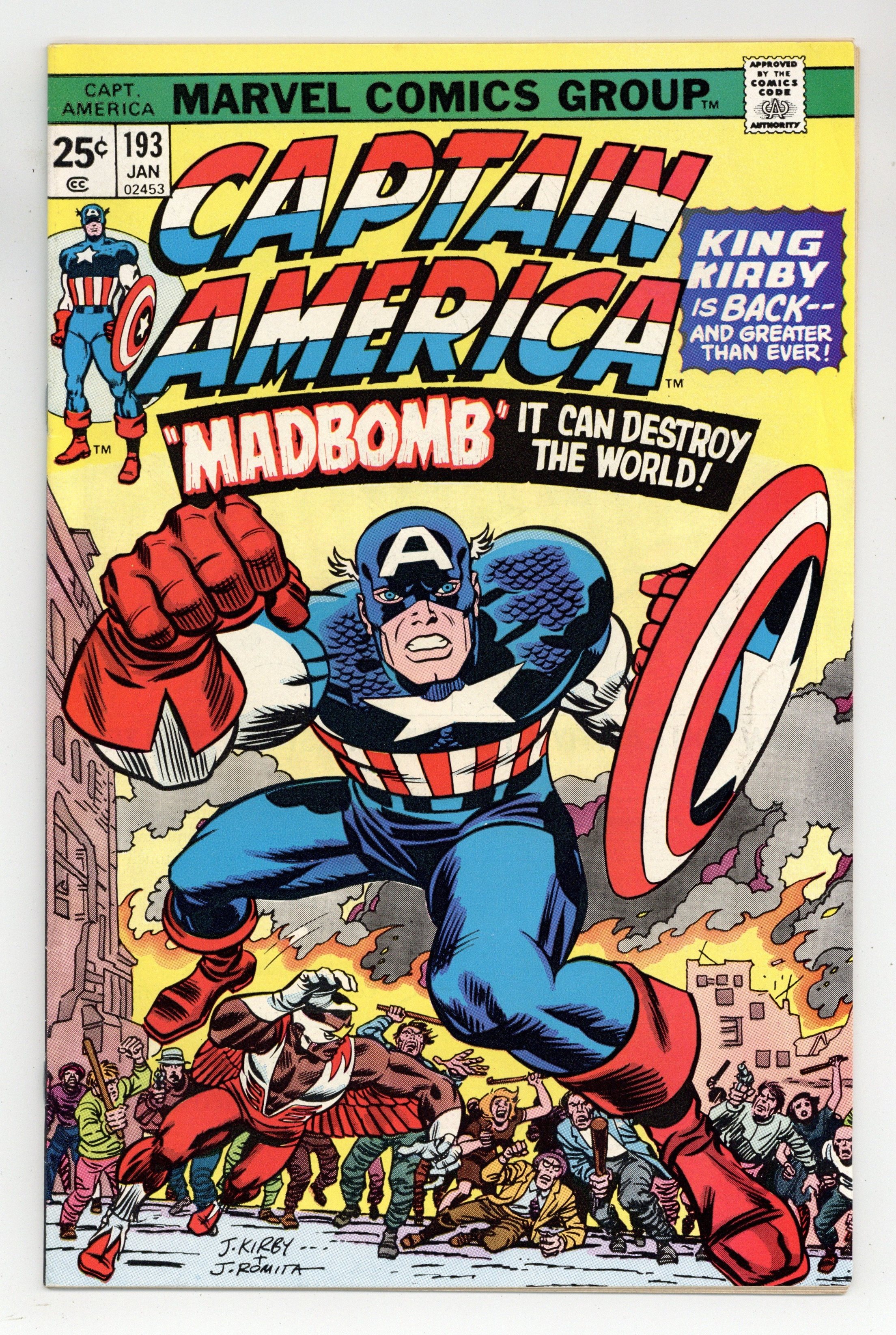 Tags: Marvel Legacy Numbering: Captain America (part 193), Captain America$32.50"The Madbomb - Screamer in the Brain!" Part 1 of 8. Script by Jack Kirby. Pencils by Jack Kirby. Inks by Frank Giacoia and Mike Esposito. Cover by Jack Kirby and John Romita Sr. (inks). The King returns to Marvel as Jack Kirby takes the reins of the Captain America title for the U.S.A.'s bicentennial year! Steve Rogers and Sam Wilson are visiting Leila Taylor's apartment in the Bronx when they hear a ruckus outside! The people in the streets are going crazy and destroying everything in sight! What is happening? Cap immediately leaps into action and engages the insane rioters! After taking several blows, the shield-slinger spots a strange device in the alleyway. It's a small madbomb! But not the big Madbomb! Once order is restored a SHIELD agent takes the Sentinel of Liberty and his partner to a secret base to meet Secretary of State Henry Kissinger. Where the duo learns of the giant Madbomb and its incredible destructive power! Cap and the Falcon will begin hunting for its next issue! (Notes: This issue begins Jack Kirby's 2-year run as the writer and penciler of the Captain America series. The letters page includes a letter from comics publisher Dean Mullaney. The letters page also contains Marvel Value Stamp series B #1 (Spider-Man).) 36 pages. Cover price $0.25.