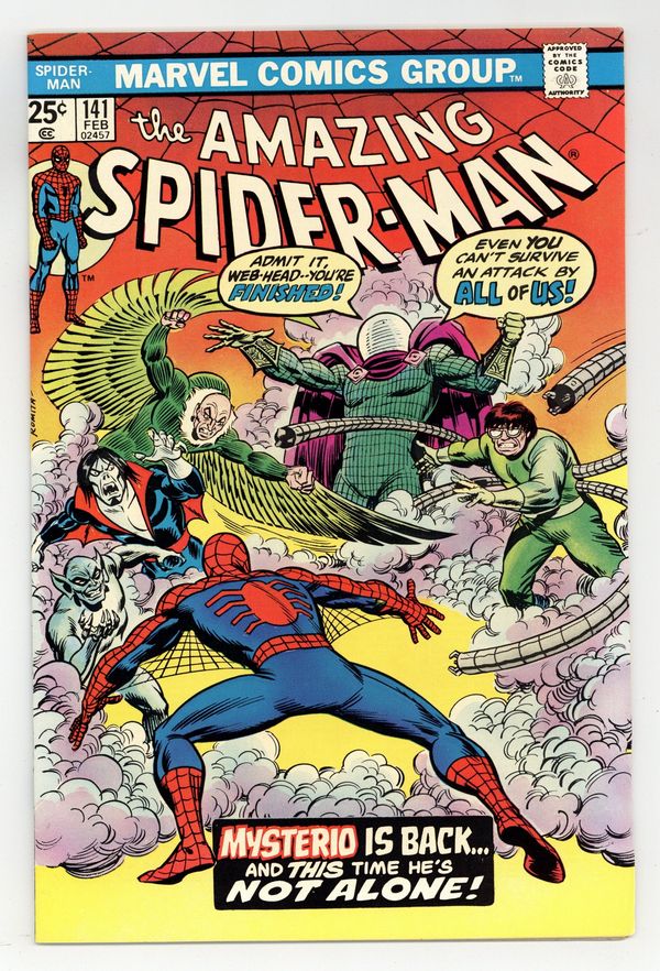 Starts Feb 9 First appearance of the second Mysterio (aka Danny Berkhart) in "The Man's Name Appears to Be...Mysterio!" Part 1 of 2. Script by Gerry Conway. Pencils by Ross Andru. Inks by Frank Giacoia and Dave Hunt (backgrounds). Cover by John Romita. The Amazing Spider-Man decides to take the Spider-Mobile for a spin! But after evading New York's Finest, he accidentally crashes into the Hudson River! Scratch one Spider-Mobile! The mist and fog tricked the web-slinger! The next day when the wall-crawler sees apparitions on his deadly foes including the Green Goblin, Dr. Octopus, and the Molten Man; he realizes that the Master of Illusion has returned! Can Spider-Man stop the madness...before he goes mad himself? Cameo appearances by Mary Jane Watson, Betty Brant, Ned Leeds, Joe Robertson, J. Jonah Jameson, and Professor Miles Warren. (Notes: The web-slinger previously battled the original Mysterio in Amazing Spider-Man 67. The letters page includes Marvel Value Stamp series A #35 Killraven by Herb Trimpe and Frank Giacoia. This story was reprinted in Marvel Tales 118.) 36 pages. 25c cover price. Cover price $0.25.