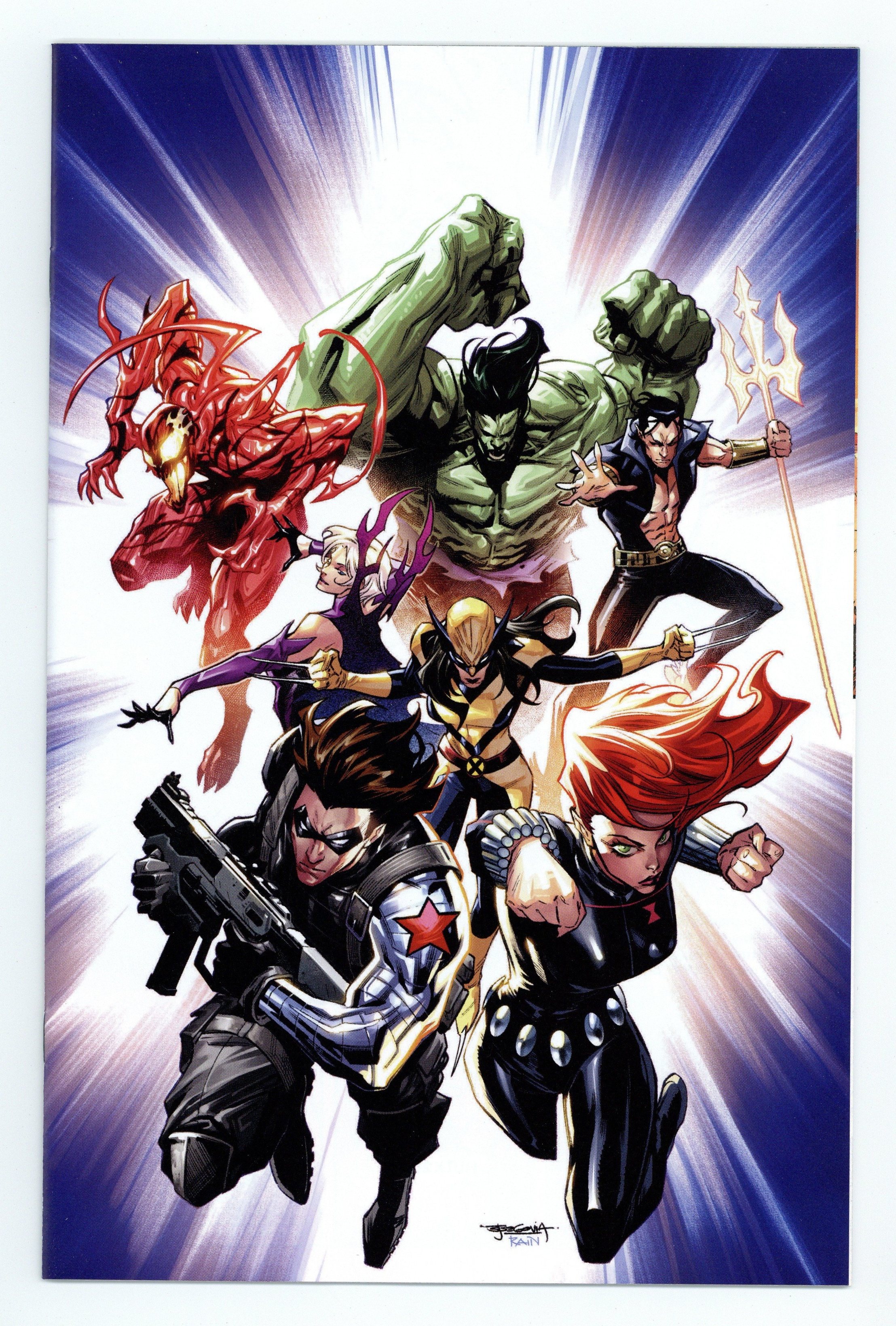 Tags: Black Widow, Thunderbolts$45.00Limited 1 for 100 Retailer Incentive Variant Cover. Written by Sam Humphries. Art by Ton Lima. Cover by Stephen Segovia. Carnage. The Hulk. Namor. Clea. Wolverine. Five of the most dangerous loners and antiheroes in the Marvel Universe. Nothing could make them work together…but Bucky Barnes and the Black Widow are going to give it a shot. Demented duplicates of the Illuminati are threatening the world, and if they figure out how to work together, they'll be as unstoppable as the originals. Bucky and Natasha need allies who will do anything to take the duplicates out - but wrangling a team of killers and monsters presents its own dangers. Welcome to the New Avengers - hope you survive the experience! 32 pages, full color. Rated T+ Cover price $4.99.