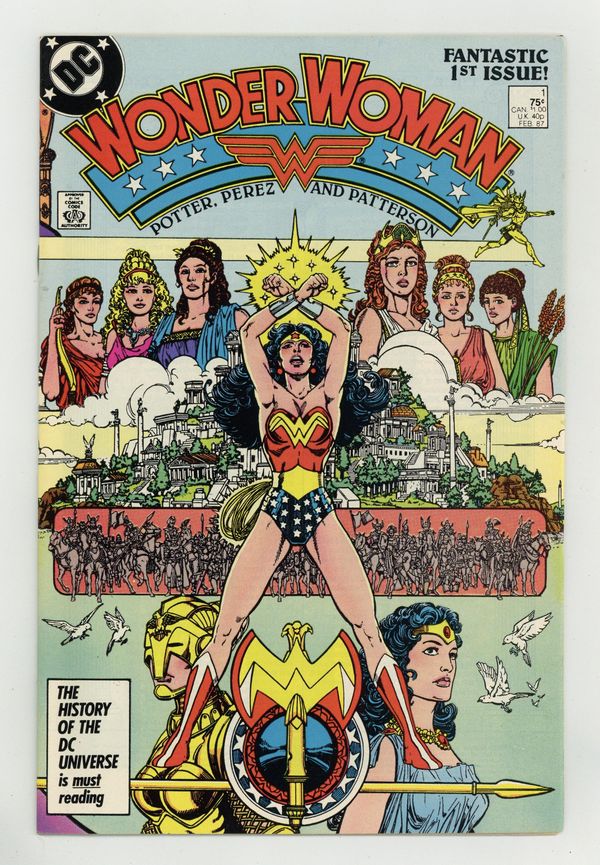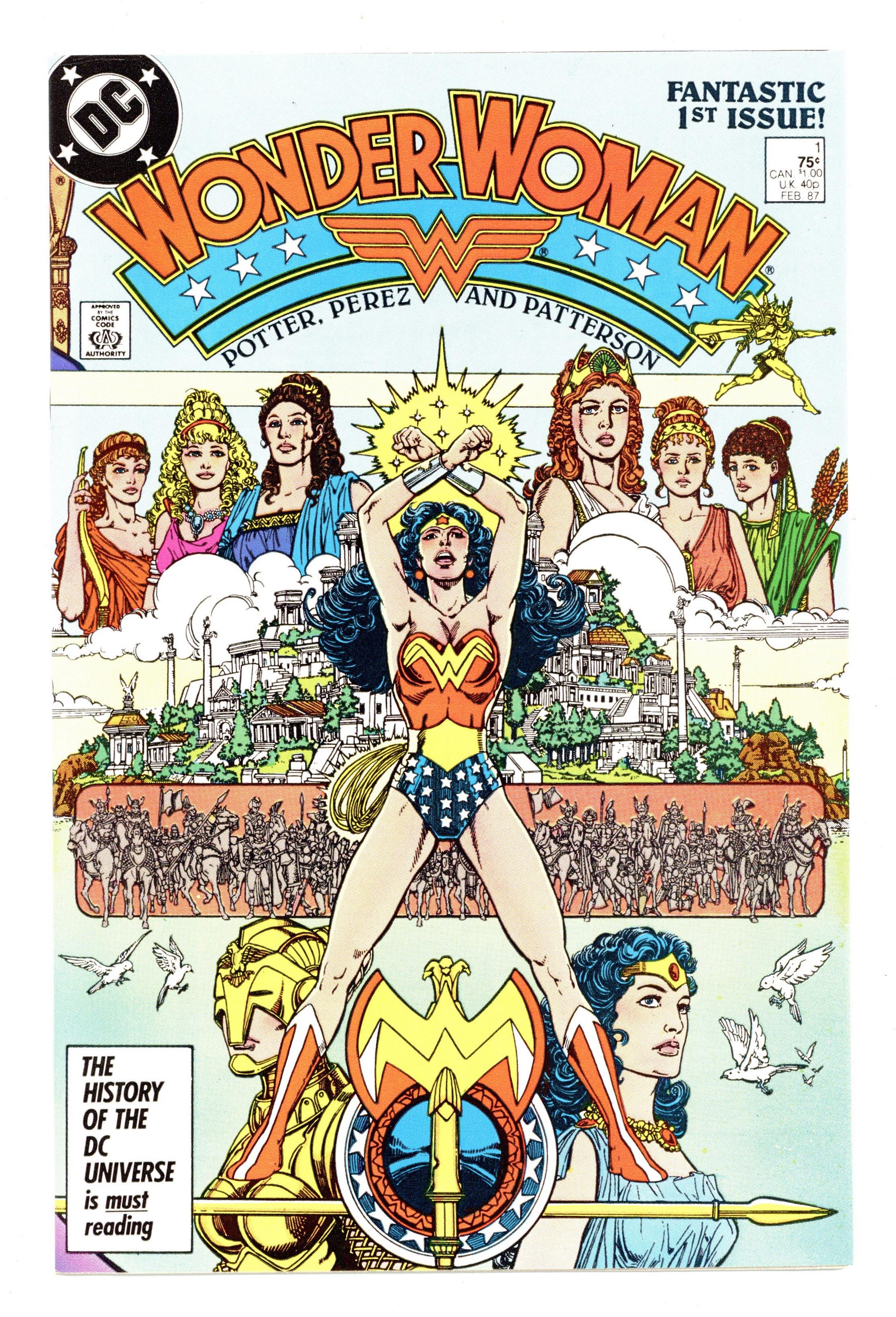 Tags: Wonder Woman$10.00Direct Edition. In this post-Crisis on Infinite Earths re-imagining of the Wonder Woman mythos, Diana is born of clay, growing on Paradise Island to become the champion of the Amazons. "The Princess and the Power!" Part 1 of 6, continued next issue. Script by Greg Potter, co-plot and pencils by George Perez, inks by Bruce Patterson. Perez inks first 2 pages and the final page. Wrap-around cover. No ads. Perez cover. 36 pgs. Cover price $0.75.