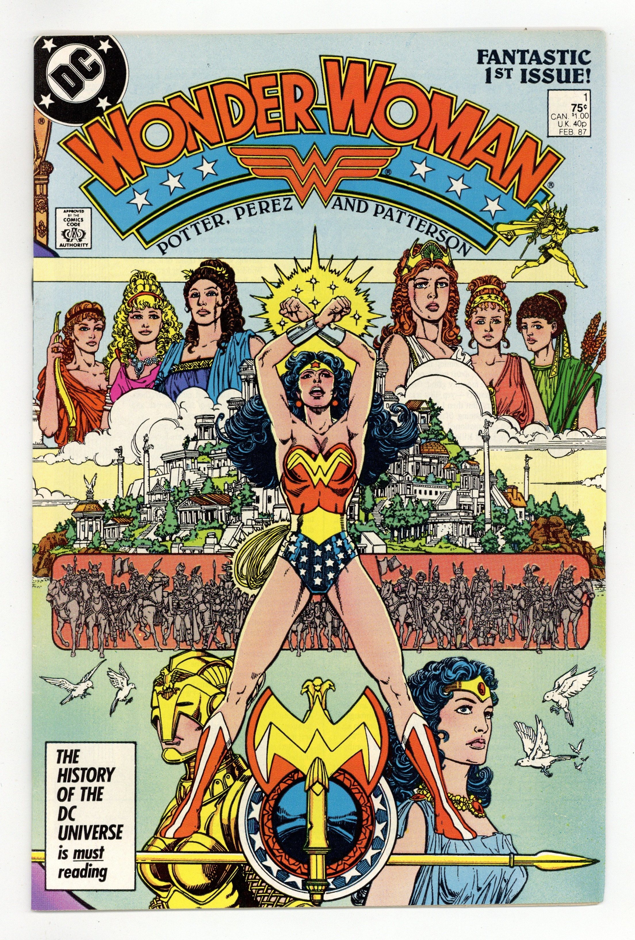 Tags: Wonder Woman$8.80Direct Edition. In this post-Crisis on Infinite Earths re-imagining of the Wonder Woman mythos, Diana is born of clay, growing on Paradise Island to become the champion of the Amazons. "The Princess and the Power!" Part 1 of 6, continued next issue. Script by Greg Potter, co-plot and pencils by George Perez, inks by Bruce Patterson. Perez inks first 2 pages and the final page. Wrap-around cover. No ads. Perez cover. 36 pgs. Cover price $0.75.
