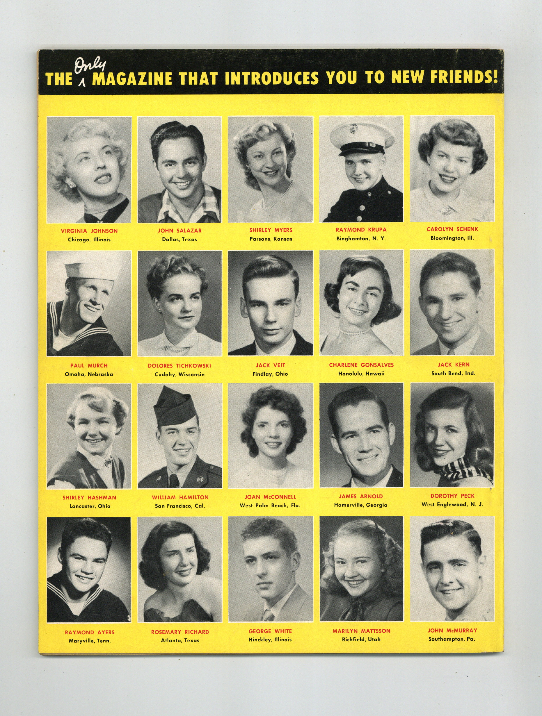 Before the internet brought eHarmony and other dating sites to the world, this magazine was connecting people from all over the country...back in 1951! This rare and slightly unusual magazine features photos and short bios for a number of teenagers and young adults, organized by age group. Plus, there are a few articles about dating, how to ask someone out...how to reject someone. 8.5" x 11", 68 pages, B&W Cover price $0.25.