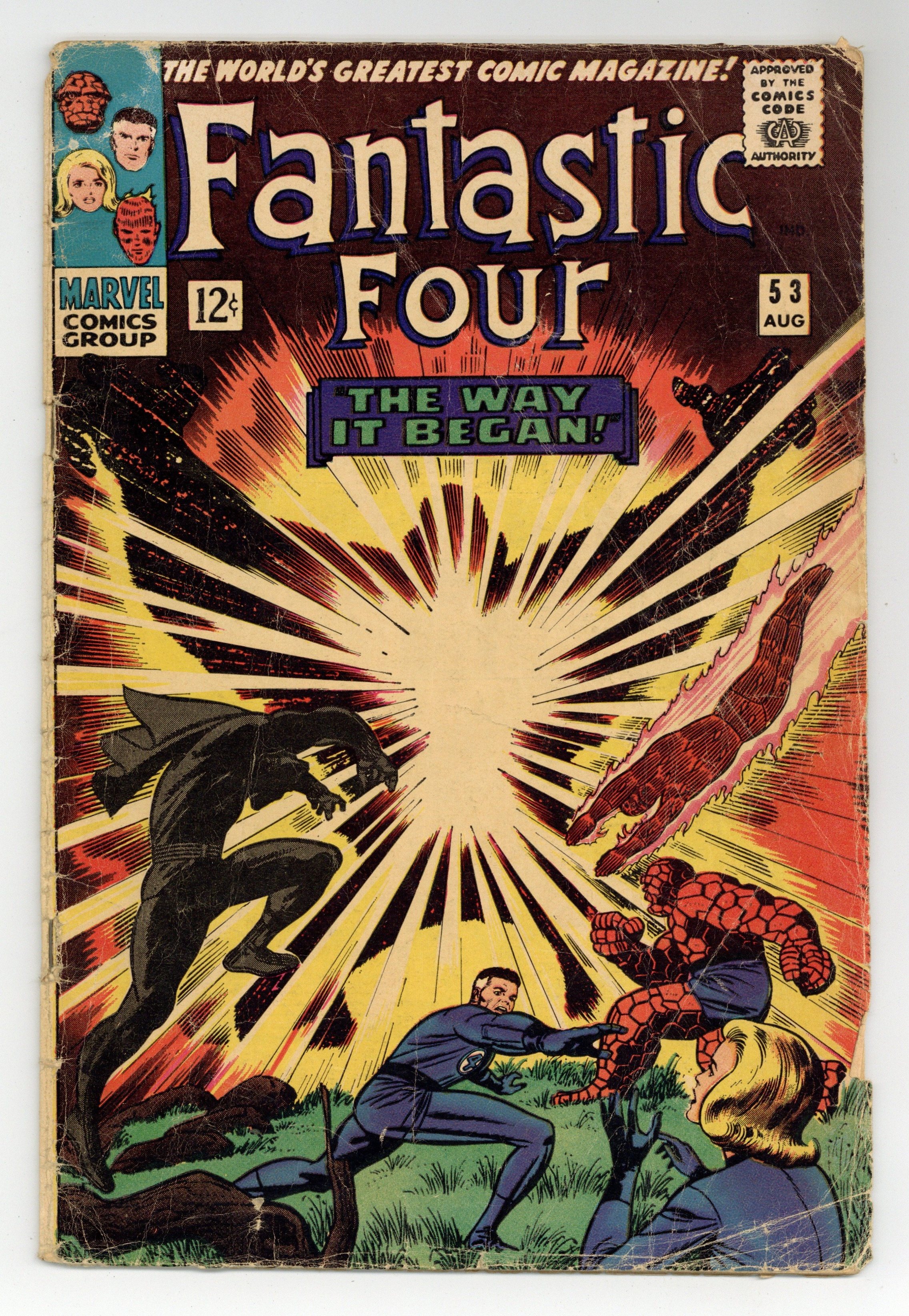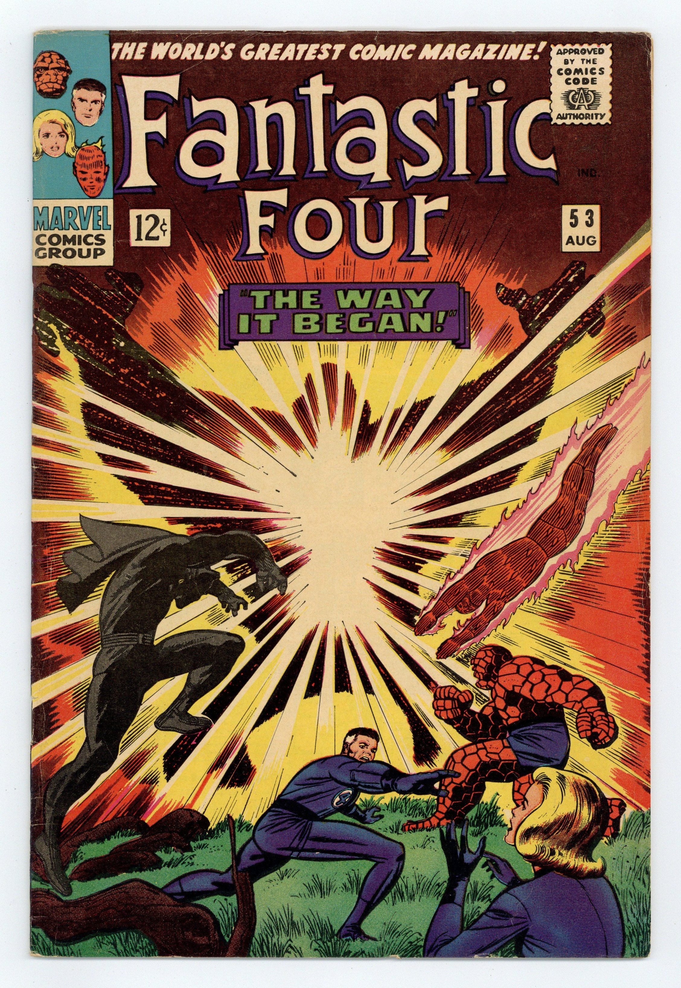 Cover pencils by Jack Kirby, inks by Joe Sinnott. Second appearance of the Black Panther in The Way It Began..!, script by Stan Lee, pencils by Jack Kirby, inks by Joe Sinnott; The Black Panther tells the story of Klaw's first attack on Wakanda; Klaw attacks the Black Panther and the FF. First appearance of Klaw, T'Chaka, and vibranium. Letter to the editor from comics writer Dennis O'Neil. 36 pgs. $0.12. Cover price $0.12.