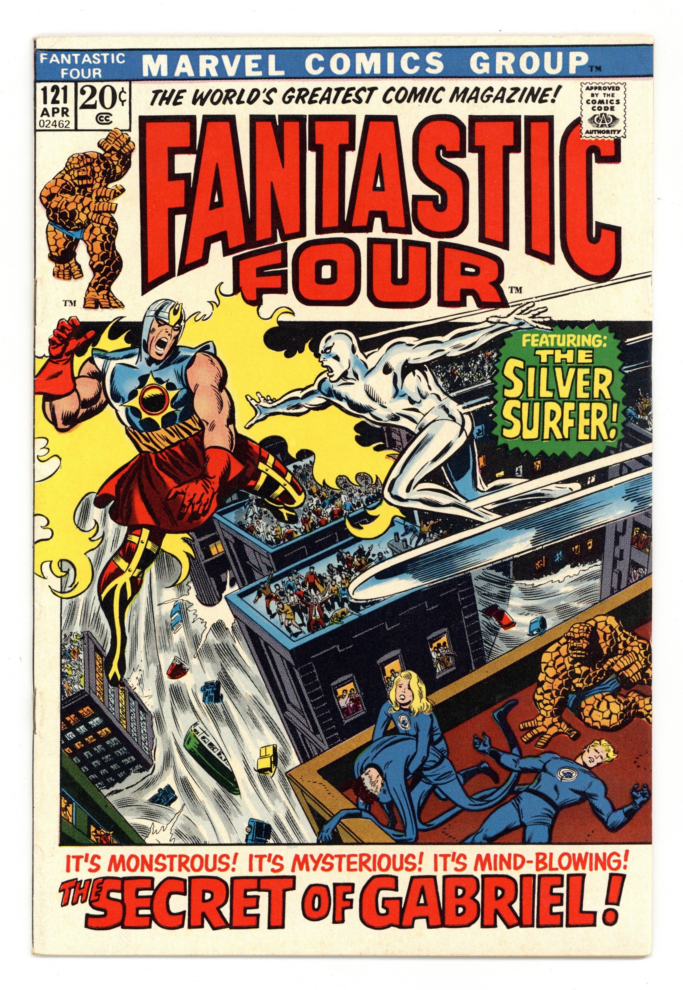 "The Mysterious Mind-Blowing Secret of Gabriel!" Part 2 of 4 Guest-starring the Silver Surfer and the Air Walker . Script by Stan Lee. Pencils by John Buscema. Inks by Joe Sinnott. Cover by John Buscema and Joe Sinnott. The powerful Air Walker continues to ravage Manhattan and terrorize the civilian populace! The Fantastic Four are helpless to stop him! New York City needs a miracle desperately! How about a silver one riding on a surf board? In dramatic fashion the Silver Surfer arrives to aid the FF! It's a spectacular slugfest in the water, on the ground, and in the sky vs. the man who walks on air! With the cosmic sky-rider by their side, can the Fantastic Four get up off the deck and knock out the Air Walker? An excellent issue! Cameo appearance by Galactus. (Note: The letters page includes a letter from television writer Charles Hoffman.) 36 pages Cover price $0.20.
