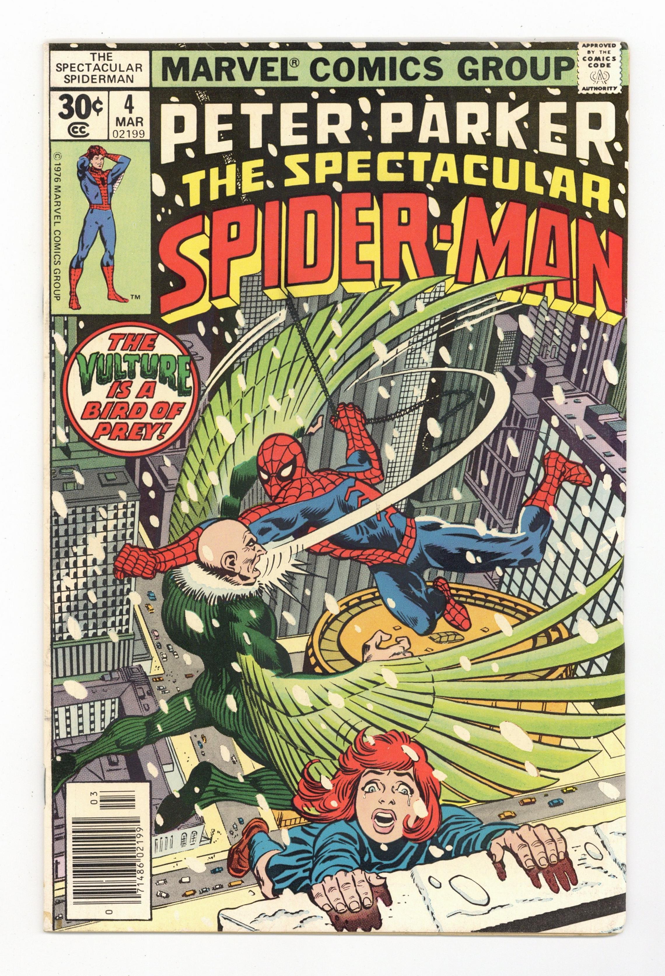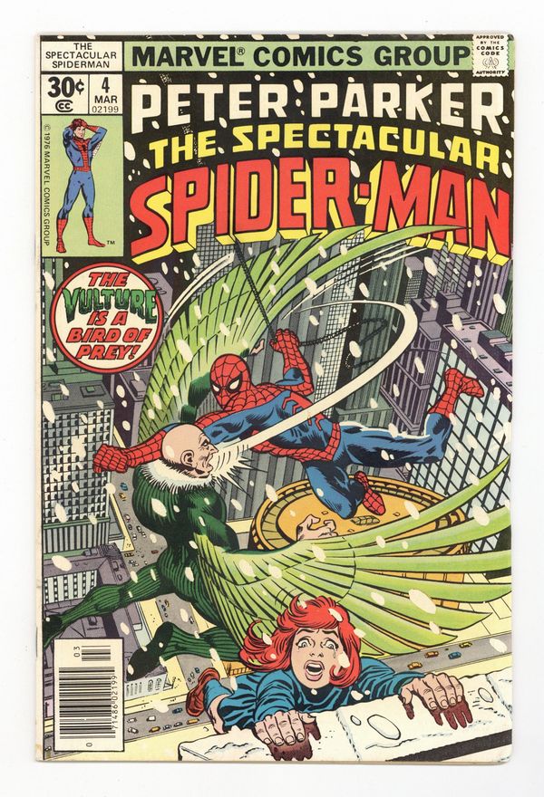 Tags: Marvel Legacy Numbering: Spectacular Spider-Man (part 4), Spider-Man$23.00"The Vulture is a Bird of Prey! Part 1 of 2. Script by Archie Goodwin. Pencils by Sal Buscema. Inks by Mike Esposito. It's the long-awaited return of the Vulture! And the old villain is still craving revenge against Spider-Man! The Vulture perches several hostages on top of a skyscraper and dares the web-slinger to rescue them. The wall-crawler and the Vulture are in the middle of another classic battle, when suddenly the duo is interrupted by...the Hitman! First appearance of the Hitman. (Notes: The Vulture previously appeared in Amazing Spider-Man 64. The red-haired woman on the cover is not Mary Jane Watson.) 32 pages Cover price $0.30.