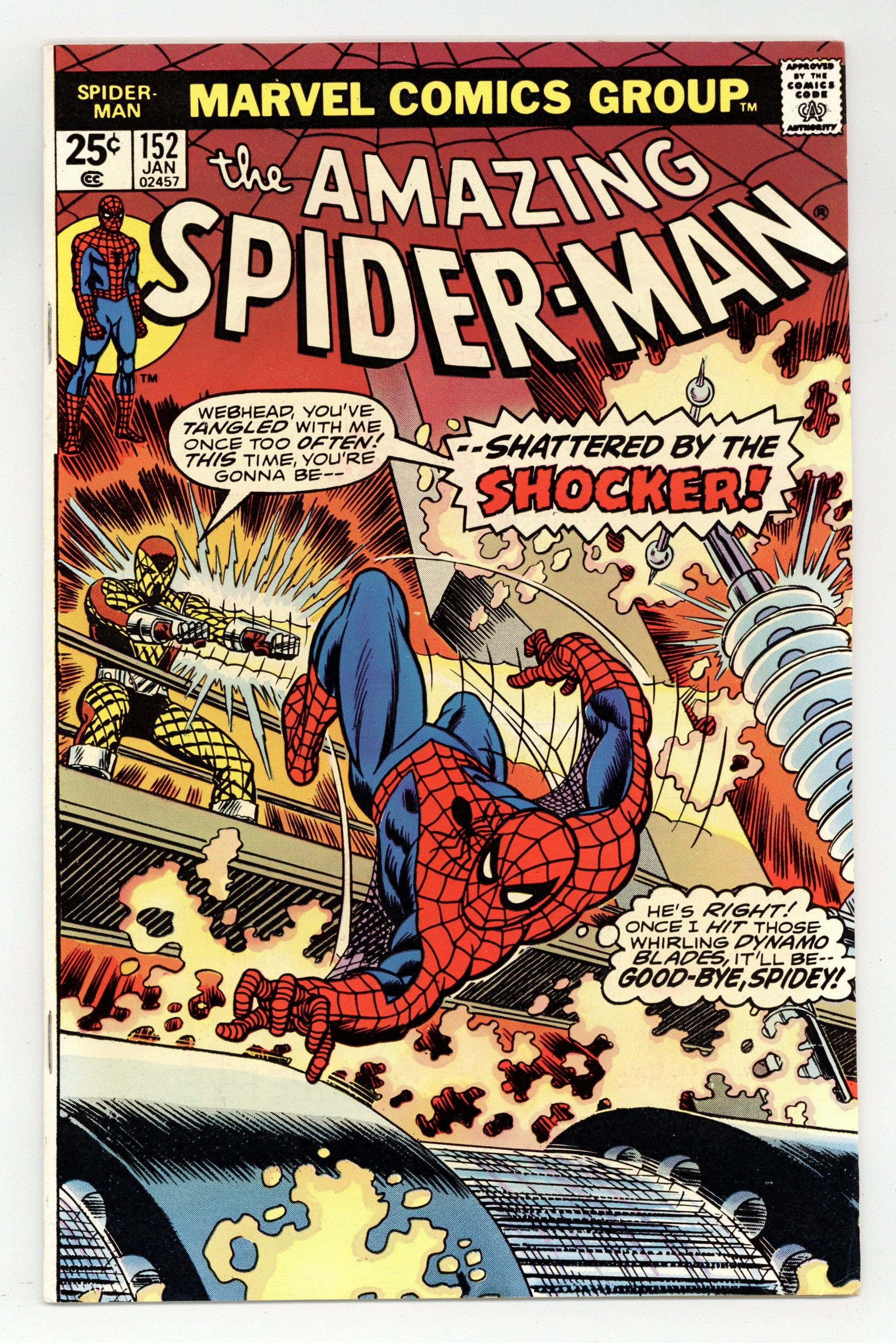 Starts Feb 9 "Shattered by the Shocker!" Part 2 of 2. Script by Len Wein. Pencils by Ross Andru. Inks by Mike Esposito, Frank Giacoia, and Dave Hunt (backgrounds). Cover by Gil Kane and John Romita. After his harrowing escape from the sewer system, the Spectacular Spider-Man itches for a rematch with the Shocker! And just a few days later the web-slinger gets his wish at the Con Ed power plant in Queens! The Shocker wants to black out the city! The wall-crawler wants to keep the lights burning! In grand fashion Spider-Man and the Shocker throw down the gauntlet (in more ways than one) until only the victor remains! Cameo appearances by Mary Jane Watson, Flash Thompson, Harry Osborn, J. Jonah Jameson, and Doctor Octopus. (Notes: The bottom right panel on page 14 is a subtle indication that Dave Hunt inked the backgrounds. The letters page includes Marvel Value Stamp series B #6 Conan the Barbarian by Barry Windsor-Smith. This story was reprinted in Marvel Tales 129.) 36 pages. Cover price $0.25.