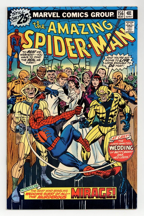 Tags: Marvel Legacy Numbering: Amazing Spider-Man (part 156), Spider-Man$51.00"On a Clear Day, You Can See...The Mirage!" Script by Len Wein. Pencils by Ross Andru. Inks by Mike Esposito and Dave Hunt (backgrounds). Cover by John Romita. Wedding bells ring in the pages of the Amazing Spider-Man! As Peter's former girlfriend (Betty Brant) and the web-slinger's future foe (Ned Leeds aka the Hobgoblin) tie the knot! The joyous ceremony proceeds as planned until a wedding crasher shows up! The Mirage! And he's not just looking for free hors d'oeuvres! Can the wall-crawler see through the Mirage and restore Betty and Ned's happy day? First Appearance of the Mirage. Appearances by Aunt May, Anna Watson, Mary Jane Watson, Flash Thompson, Harry Osborn, Liz Allan, J. Jonah Jameson, Joe Robertson, and Doctor Octopus. (Notes: The Mirage appears next in Marvel Two-in-One 96. The letters page includes Marvel Value Stamp series B #83 the Incredible Hulk. This story was reprinted in Marvel Tales 133. A 30-cent cover price variant exists for this issue.) 36 pages. Cover price $0.25.