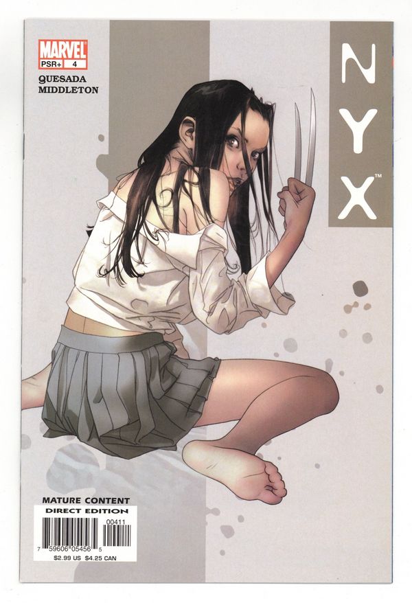 Tags: X-23 Appearances (part 2)$60.00Written by JOE QUESADA Cover & pencils by JOSHUA MIDDLETON With a penchant for picking up strays, newcomer Tatiana picks up more than she bargained for when she manifests a striking mutant ability and catches the attention of Kiden's wayward gang. The cast of mutant outcasts grows in the next chapter of Quesada and Middleton's hometown homage to hot dogs, alley cats and misguided youth. 32 PGS./MARVEL PSR+...$2.99 UPC: 5960605456-00411 NEW ONGOING SERIES! A MUTANT WITH TIES TO THE X-MEN IS REVEALED! Cover price $2.99.