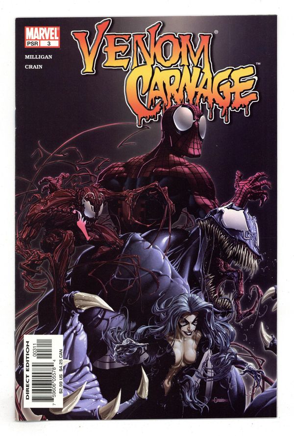Tags: Spider-Man$8.00Written by Peter Milligan Cover & Art by Clayton Crain It's round three of the three-way battle between Venom, Carnage, and a new and possibly even more deadly symbiote. 32 PGS./MARVEL PSR ...$2.99 UPC: 5960605578-00311 Cover price $2.99.