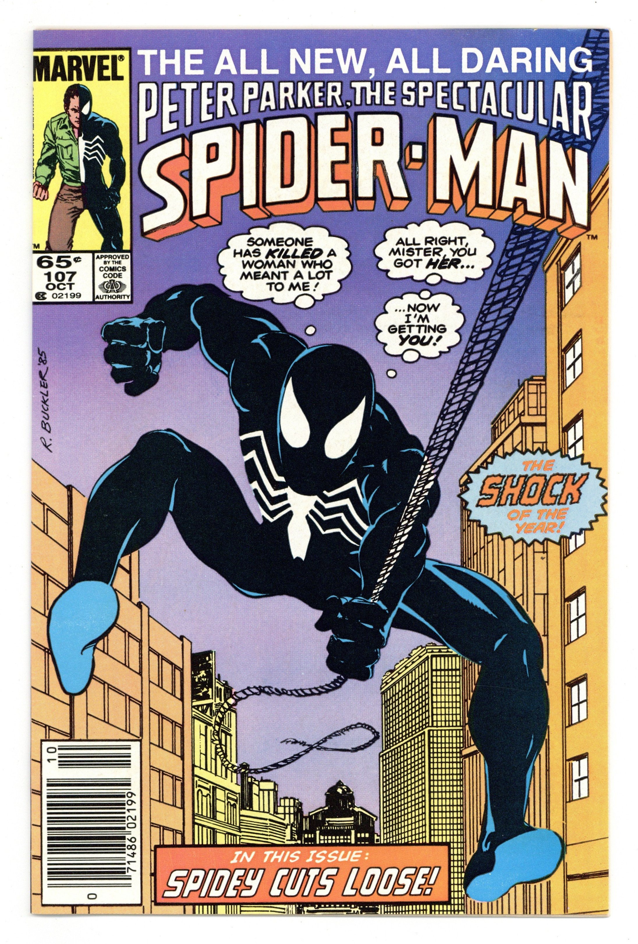 Newsstand Edition. "Original Sin" Part 1 of 4. Guest-starring Daredevil. Script by Peter David. Pencils by Rich Buckler. Inks by Brett Breeding. Cover by Rich Buckler. The critically acclaimed Death of Jean DeWolff storyline begins with this issue. In a stunning development, police captain Jean DeWolff is found murdered in her apartment. The entire city is in a state of shock over the killing including the police department, the staff at the Daily Bugle, and the Amazing Spider-Man. The web-slinger (in his black costume) begins investigating the homicide by meeting with the detective assigned to the case, Stan Carter. However, another superhero, Daredevil, gets the first shot at stopping the murderous rampage of the Sin-Eater! First appearance of the Sin-Eater. 32 pages Cover price $0.65.