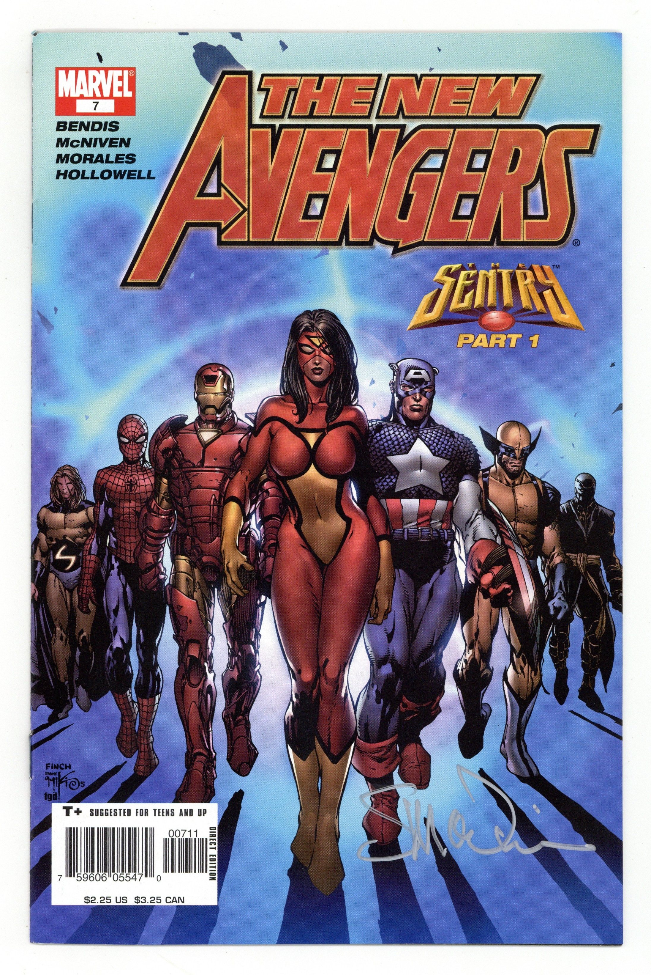 The Sentry: Part 1 of 3 - Written by BRIAN MICHAEL BENDIS Penciled by STEVE MCNIVEN Cover by DAVID FINCH. David Finch takes a well-deserved nappy time to give Young Gun guest artist Steve McNiven a moment to shine. The mysteries and tragedies of the Sentry come to the forefront as the New Avengers come to his aid. Who is behind the Sentry's tragic life? The answer WILL SHOCK YOU! 32 PGS./Marvel PSR NOTE: 1st appearance of the Illuminati (a secret group comprised of Iron Man, Mister Fantasic, Namor, Professor X, Doctor Strange, and Black Bolt). Cover price $2.25.
