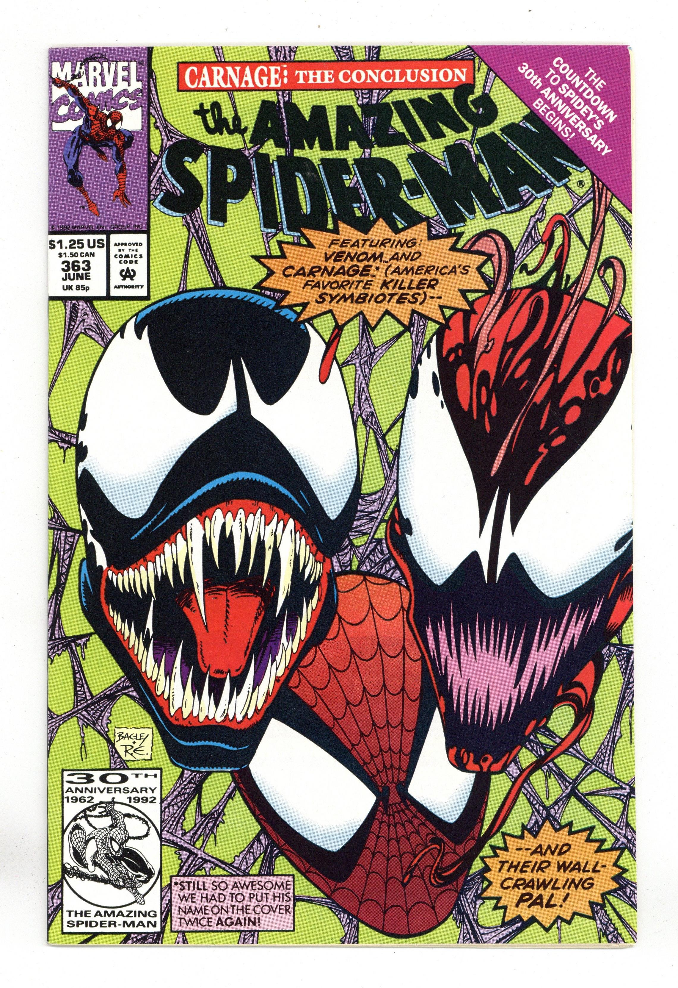 Tags: Marvel Legacy Numbering: Amazing Spider-Man (part 363), Spider-Man$11.50Direct Edition. "Savage Grace!" Part 3 of 3. Script by David Michelinie. Pencils by Mark Bagley. Inks by Randy Emberlin. Cover by Mark Bagley and Randy Emberlin. Carnage takes J. Jonah Jameson hostage and drags him to a heavy metal concert at Madison Square Garden! The psychotic killer plans to execute JJJ in front of thousands of headbangers! But before Carnage can deliver the deathblow, Spider-Man and Venom strike! The ferocious fight leads into the subway tunnels and then back onto the concert stage! Where thanks to MSG's awesome sound system, the web-slinger tries to knock out both Carnage and Venom! The wall-crawler's ploy better work, because double-crossing Venom could have lethal consequences! A fantastic finish! First appearances of the Richard Parker and Mary Parker life model decoys (LMD's). Cameo appearances by Joe Robertson, Mr. Fantastic, and the Human Torch. (Notes: Venom appears next in the one-shot: Spider-Man Special Edition -- The Trial of Venom (1992). Carnage returns in the first issue of Spider-Man Unlimited (1993 1st series) to kick off the Maximum Carnage saga.) 36 pages. $1.25 cover price. Cover price $1.25.