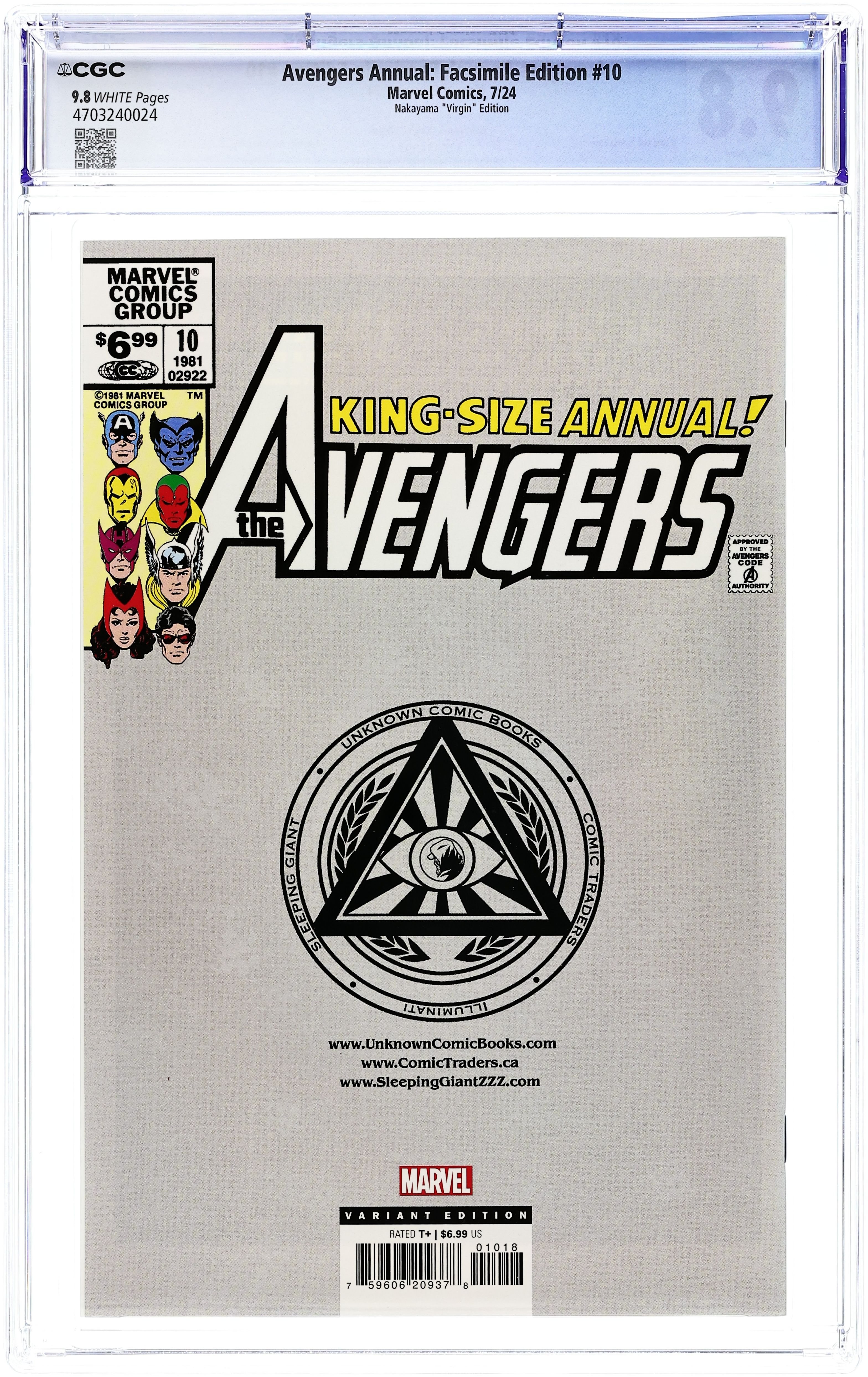 Comics Illuminati (Unknown Comic Books, Comic Traders, and Sleeping Giant) Exclusive Virgin Cover by David Nakayama. Facsimile reproduction of Avengers (1963 1st Series) Annual #10. Written by Chris Claremont. Art by Michael Golden. This one really does have it all: the Avengers, the X-Men, Spider-Woman and the first appearance of Rogue! When Jessica Drew saves an unconscious Carol Danvers from plummeting from the Golden Gate Bridge, she seeks the aid of the X-Men - and Professor X discovers that Carol's powers and memories have been absorbed by a dangerous young mutant called Rogue! This deadly new recruit to Mystique's Brotherhood of Evil Mutants won't stop there - next, she targets Captain America and Thor! The remaining Avengers must battle the Brotherhood with Spider-Woman alongside them! But when the dust settles, what will the future hold for Carol Danvers, the woman who was once Ms. Marvel? It's one of the all-time great Marvel comic books, boldly re-presented in its original form, ads and all! Reprinting AVENGERS ANNUAL #10. 48 pages, full color. Rated T+ Cover price $6.99.