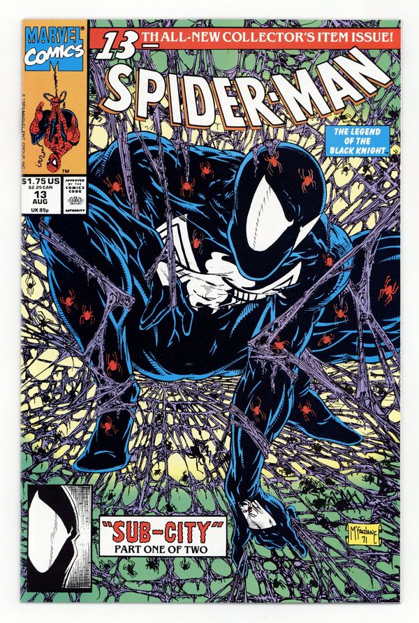 Direct Edition. Sub-City Part 1 of 2. Script and art by Todd McFarlane. Cover by Todd McFarlane. In Midtown Manhattan homeless people are disappearing off the streets. And a Daily Bugle reporter suspects foul play! The wall-crawler decides to stake out the area...and wait for something or someone suspicious to show up. And sure enough...a strange creature does -- right out of the sewer system! Spider-Man wants to follow into the sewers to investigate further, but he needs to wear his old black costume for camouflage. However that's a major nonstarter for Mary Jane...since she hates Spidey's black costume! What is a married web-slinger to do? Cameo appearances by J. Jonah Jameson and Morbius. (Note: The cover is an homage to Spider-Man (1990) issue #1.) 32 pages. Cover price $1.75.