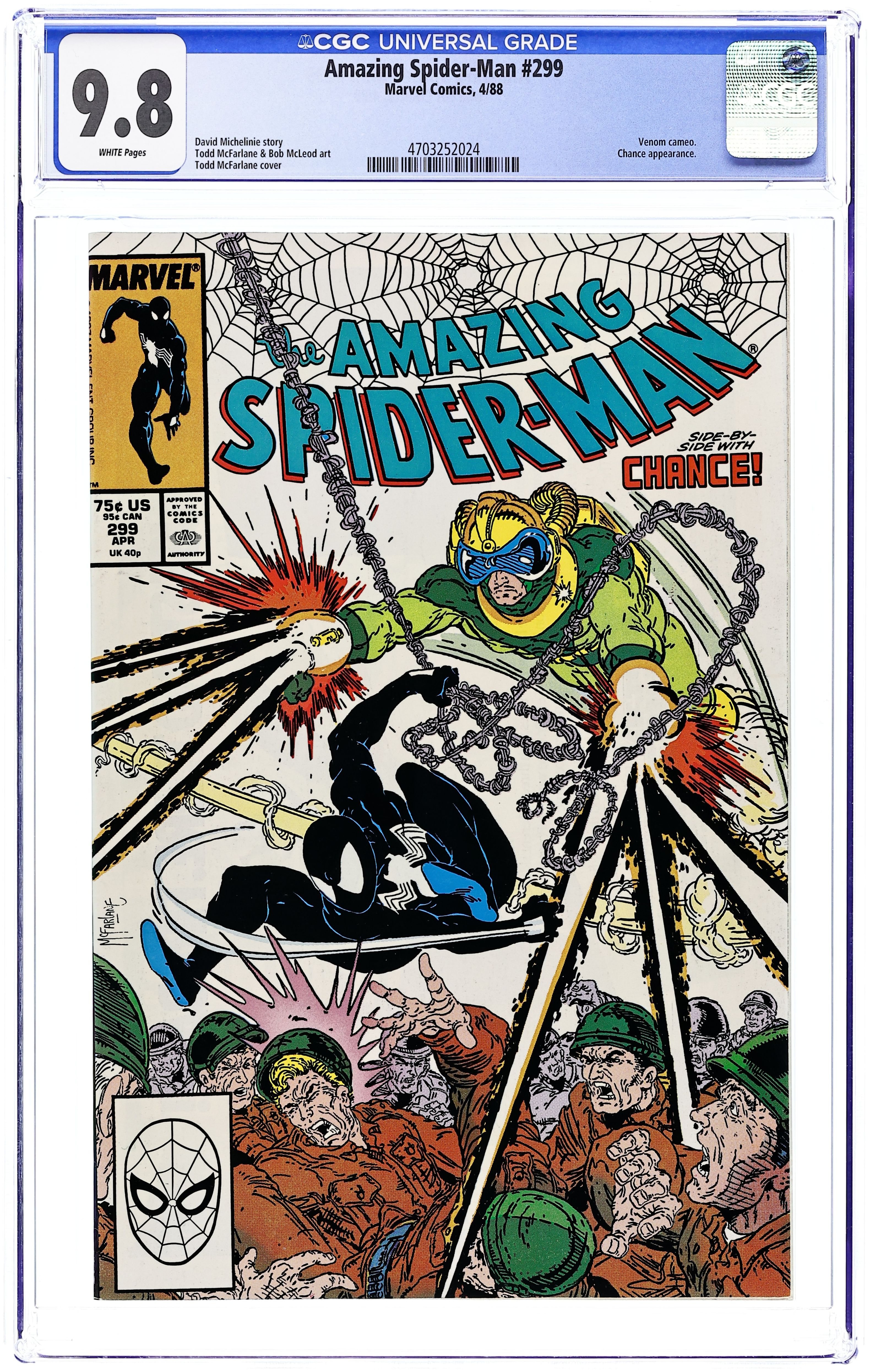 Tags: Marvel Legacy Numbering: Amazing Spider-Man (part 299), Spider-Man$130.00Direct Edition. "Survival of the Hittist!" Part 2 of 2. Script by David Michelinie. Pencils by Todd McFarlane. Inks by Bob McLeod. Cover by Todd McFarlane. After their waterfront arms theft goes awry, the Life Foundation turns the tables on Chance! The mysterious survivalist group abducts the mercenary and takes him to their secret headquarters in northern New Jersey! But thanks to a well-placed spider tracer, the web-slinger infiltrates the foundation's secluded colony the next day...and rescues Chance! So now the adversaries of 24 hours ago suddenly become allies to avoid death...courtesy of the Life Foundation! First appearance (and cameo on the last page) by Venom. Cameo appearances by Eddie Murphy, Paul Schaffer, and Joe Robertson. Last 75¢ issue. 36 pages, full color. (Note: Chance returns in Amazing Spider-Man 336.) Cover price $0.75.