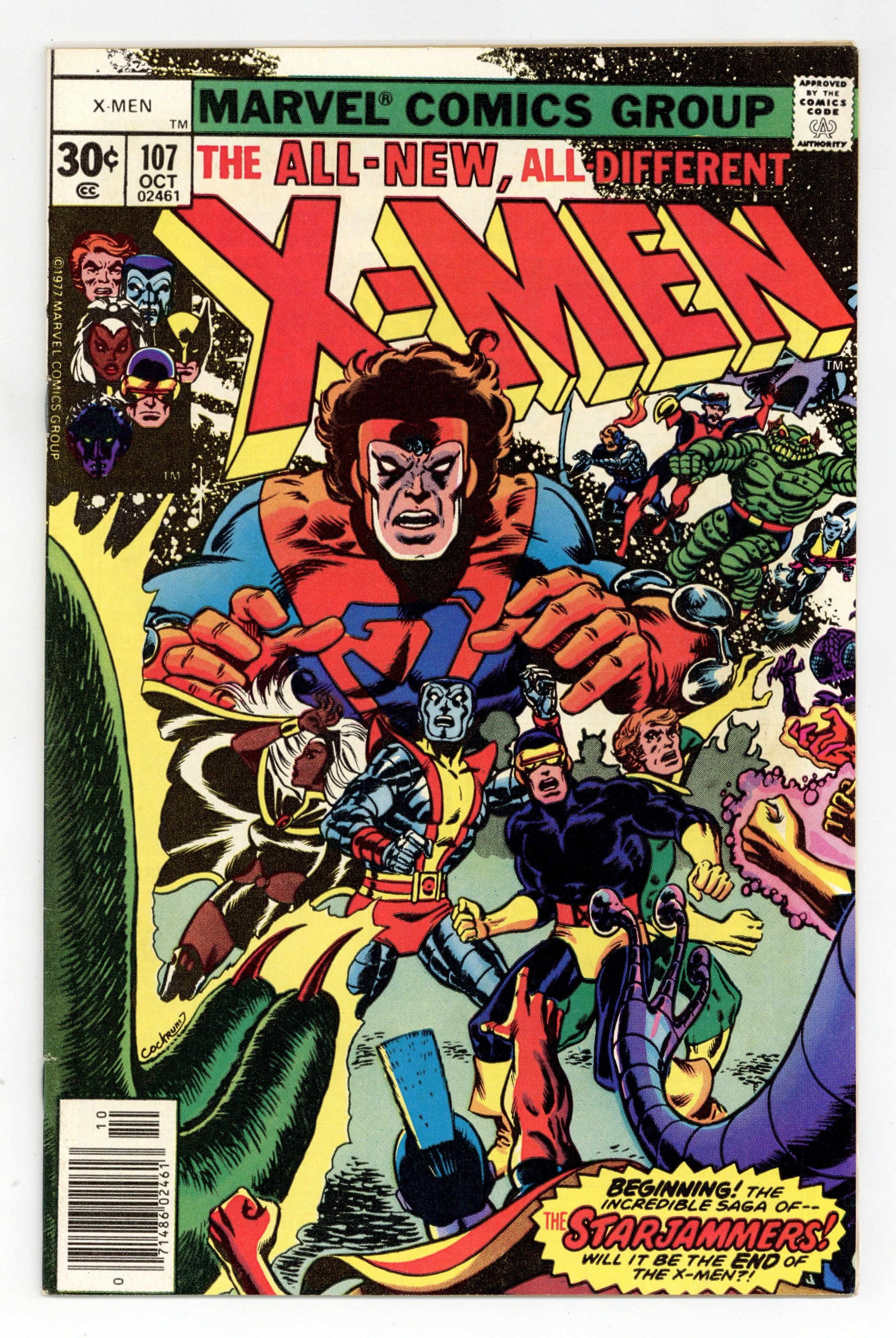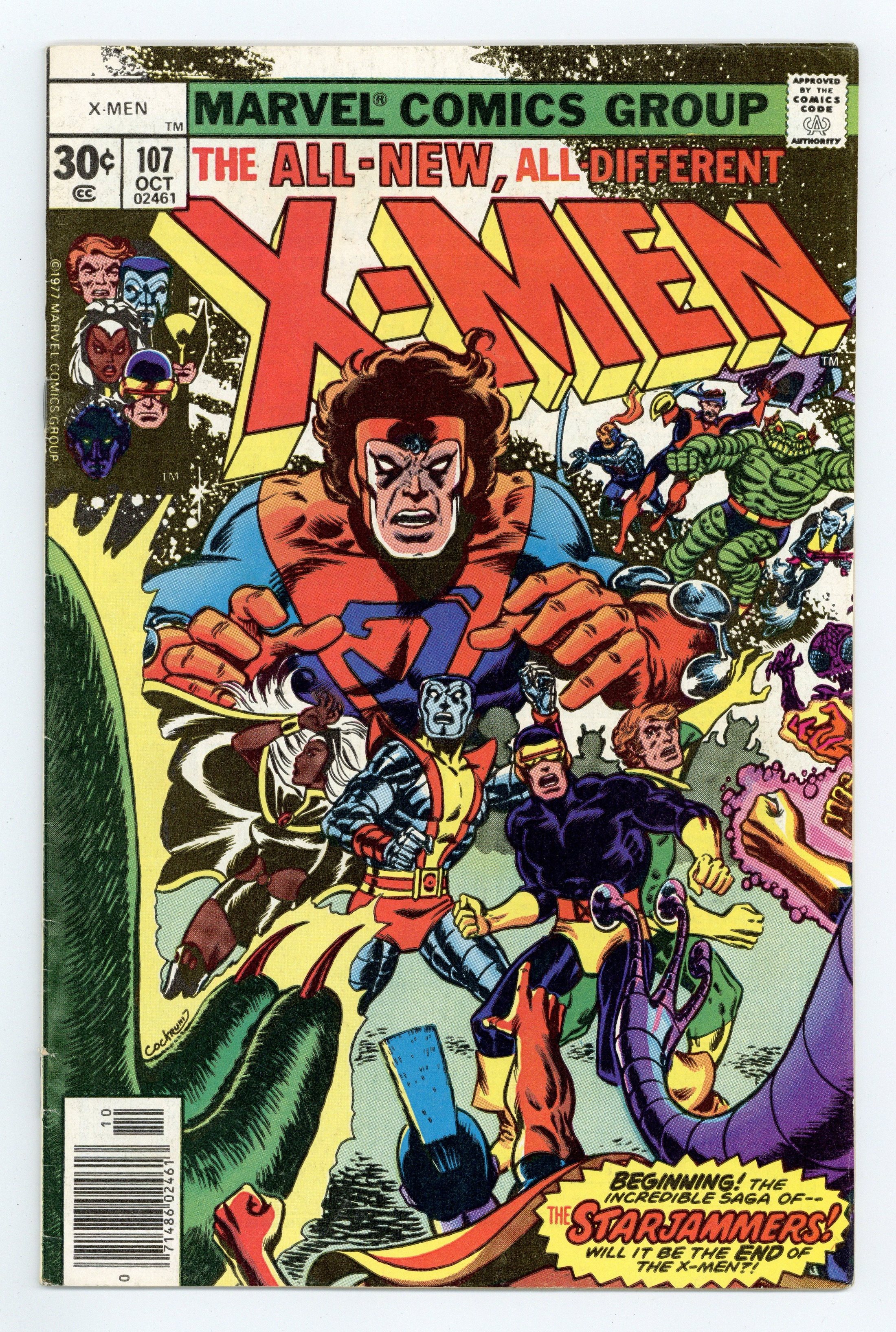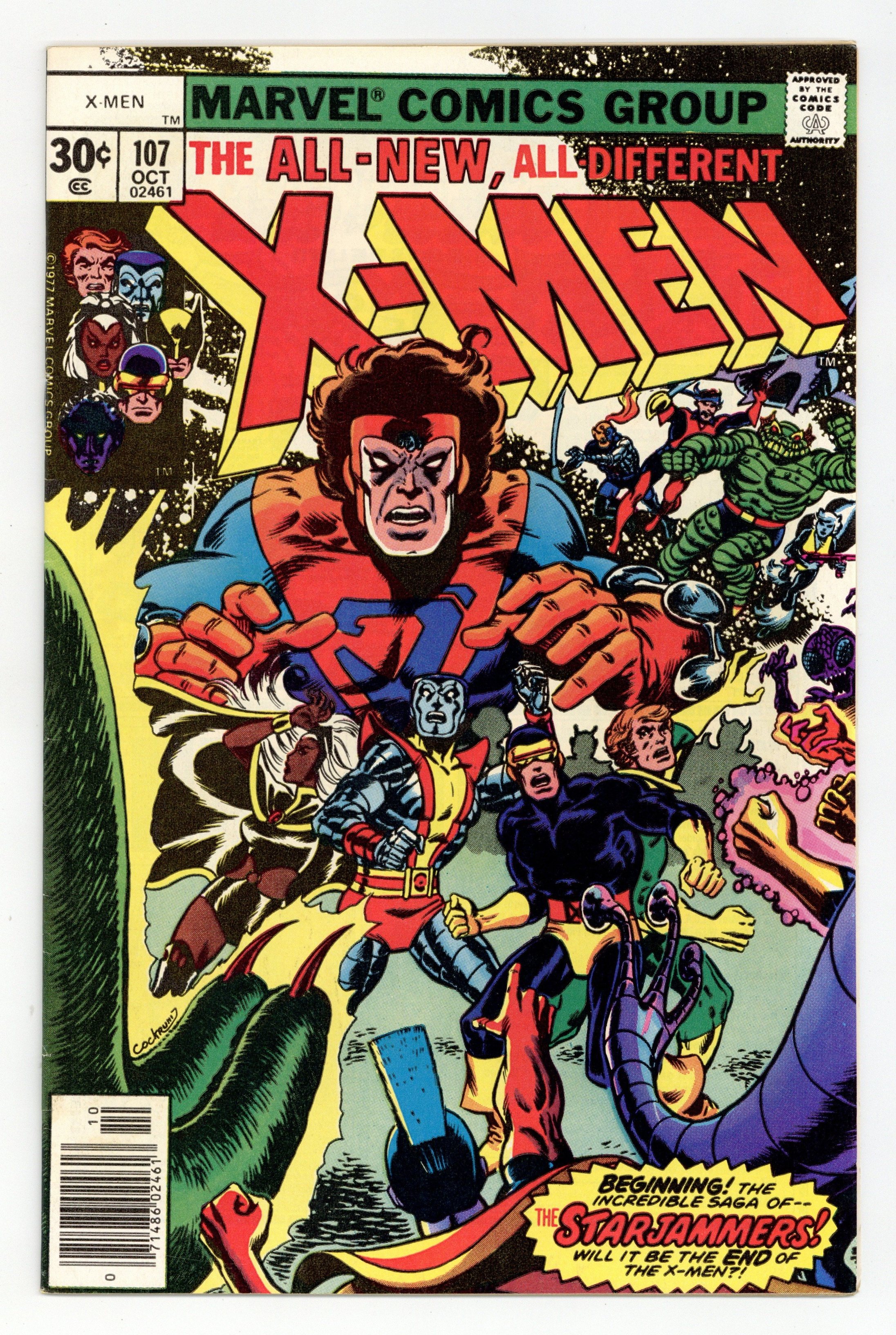 Starts Apr 4 "Where No X-Man has Gone Before!" Part 2 of 3. Guest-starring the Starjammers (1st full appearance). Story by Chris Claremont. Art by Dave Cockrum and Dan Green. Story continued from Uncanny X-Men #105. Thanks to the awesome power of Phoenix, the X-Men have arrived on the far side of the universe. However things go from bad to worse when they are greeted by a small army of super-beings under the thrall of a sadistic madman. NOTE: 1st appearance of the Starjammers - Raza and Hepzibah - and the Shi'ar Imperial Guard. 36 pgs. Cover price $0.30.