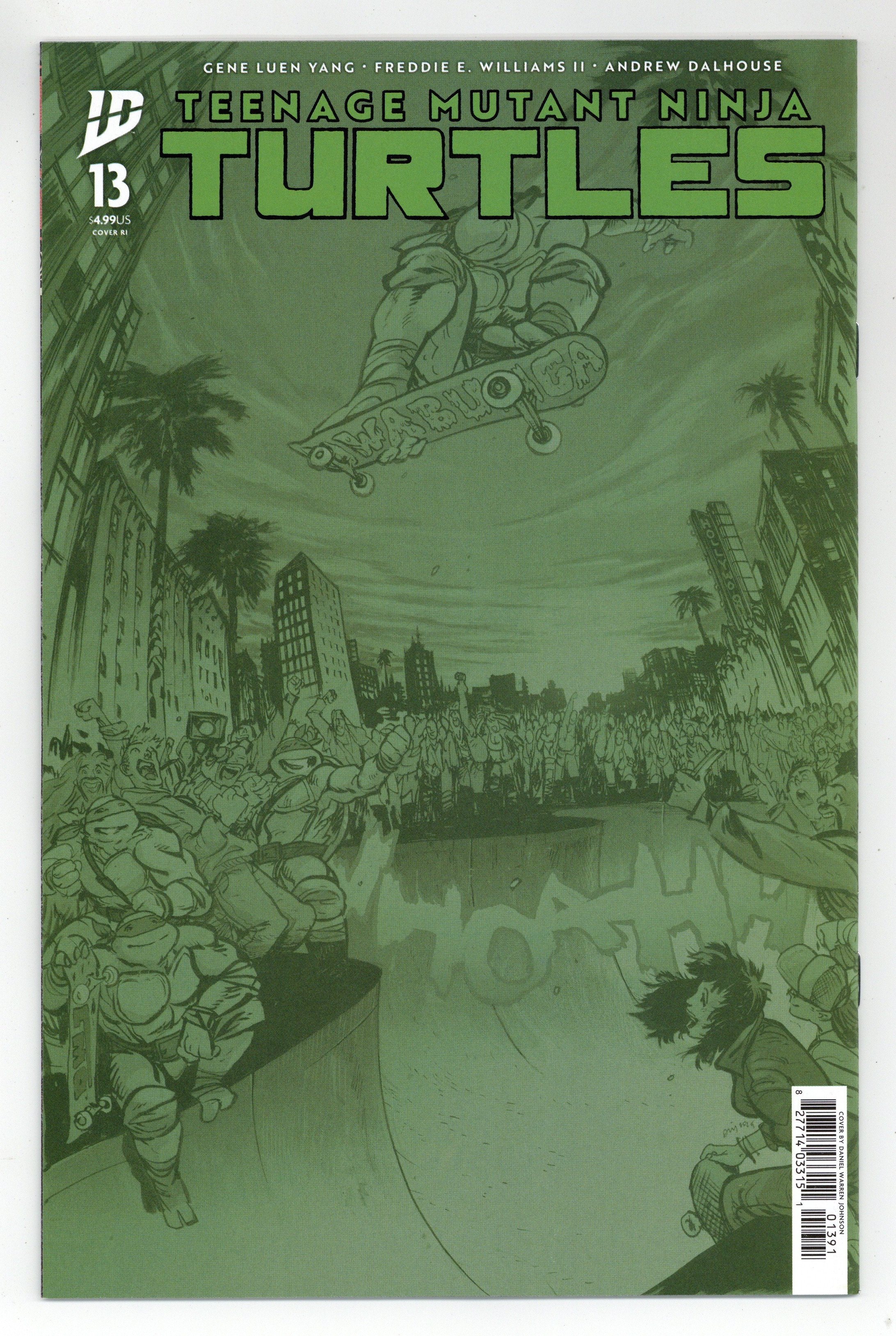 Published Dec 2025 by IDW Publishing.$35.00Limited 1 for 75 Retailer Incentive Variant Cover. (W) Gene Luen Yang (A) Freddie E. Williams II (CA) Daniel Warren Johnson A new era of TMNT begins! Acclaimed Eisner-winning writer Gene Luen Yang (American Born Chinese, Avatar: The Last Airbender, Superman Smashes the Klan) takes on writing duties for TMNT! Following the stunning events of TMNT #12, the Turtles face a different New York…one where they are viewed as heroes! The celebration will be short-lived as new threats vie for control. The mutant yak Papa Beng is determined to widen the power base for his gang. Yet little does he know that he and other TMNT villains are being stalked by a powerful new assassin…Ujigami! Cover price $4.99.