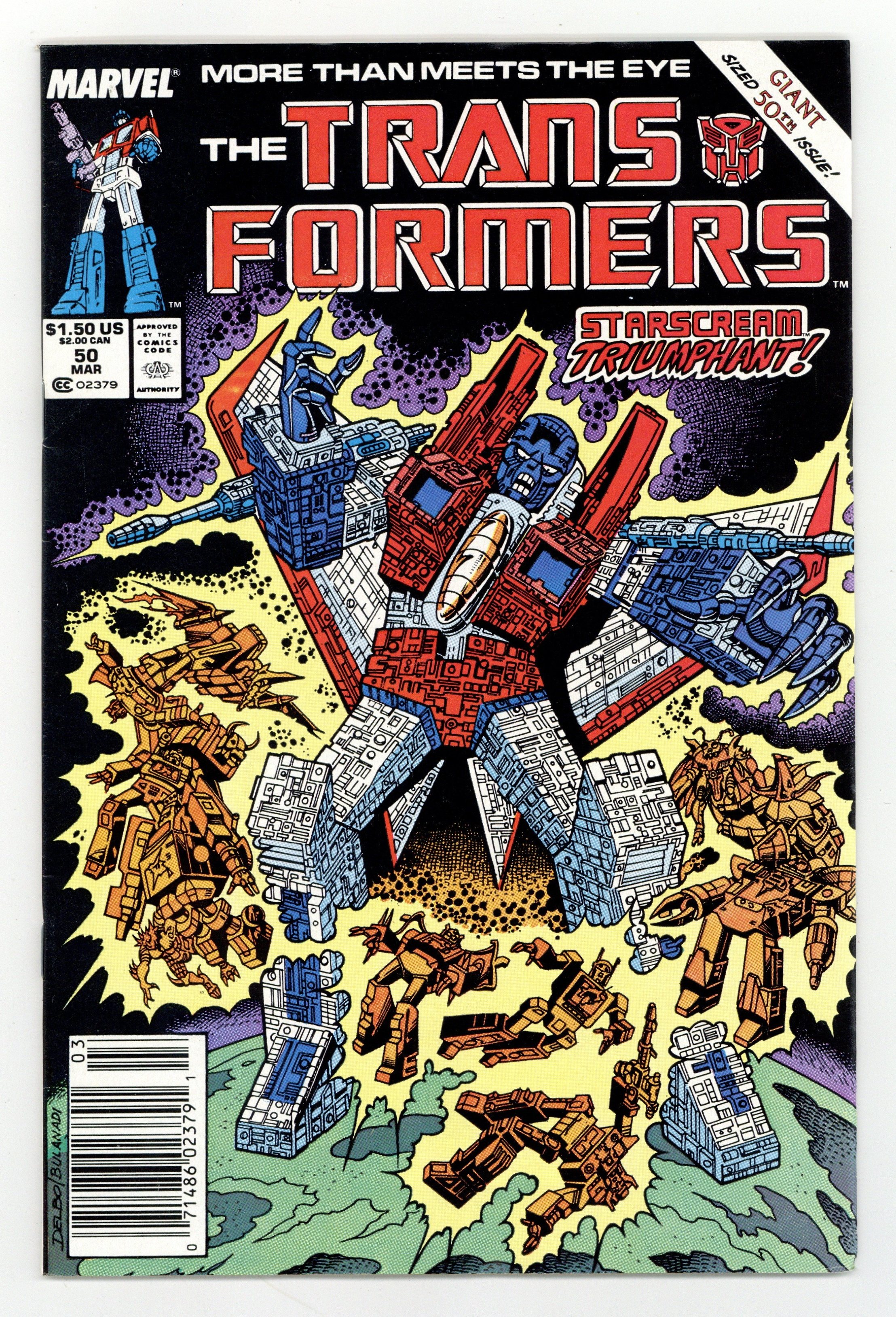 Newsstand Edition. Double size issue featuring the conclusion of the Underbase Saga in which the Decepticon Starscream unleashes a plan to keep both the Decepticons and Autobots occupied while he obtains the Underbase, which contains more knowledge and power than any known object in the universe, and is heading toward Earth in "Dark Star." Script by Bob Budiansky and art by Jose Delbo & Dave Hunt. Cover by Jose Delbo and Danny Bulanadi. Cover price $1.50.