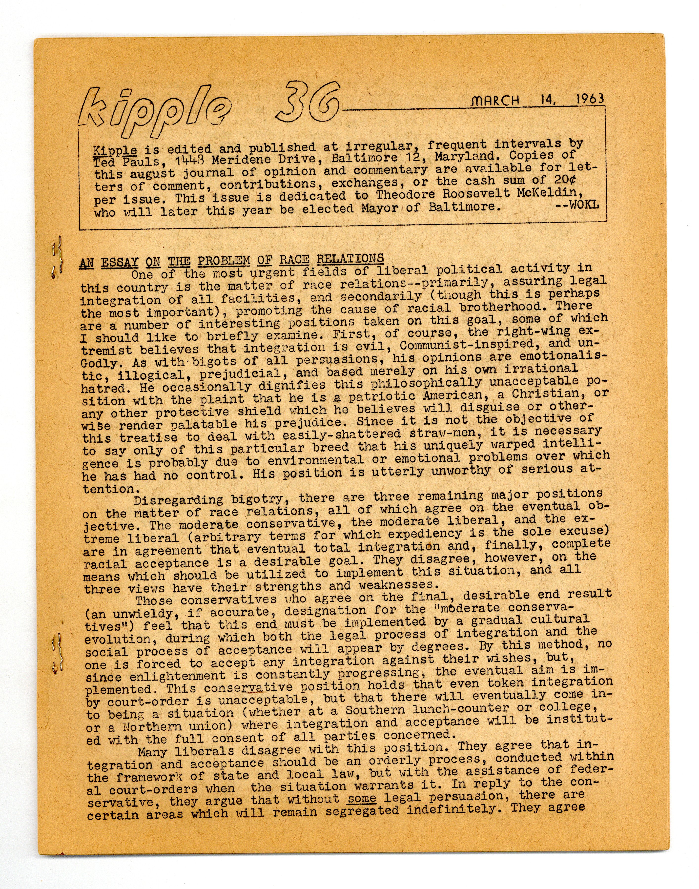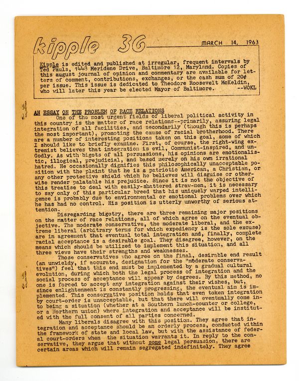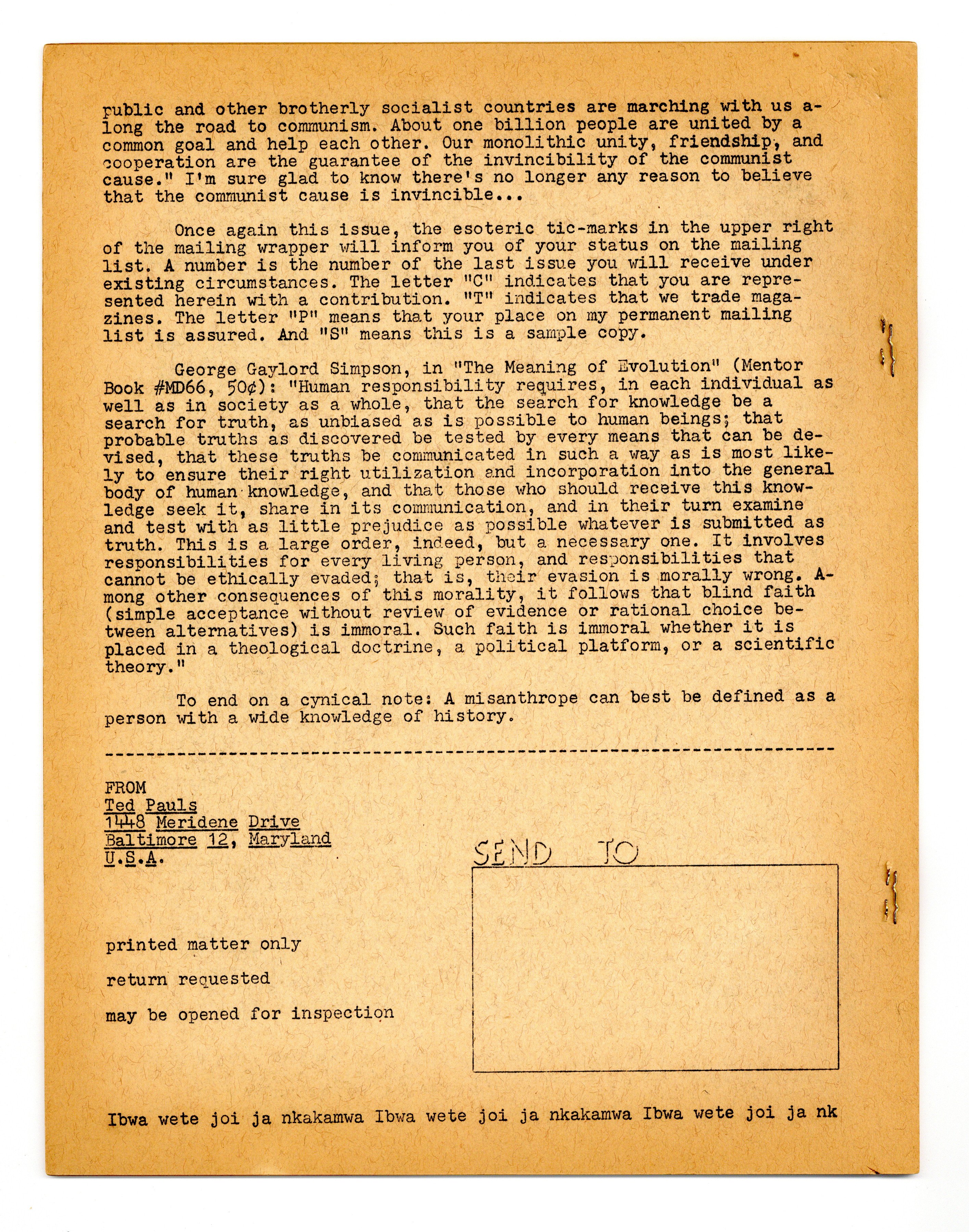$28.00Long Running SF/Political Fanzine edited by Ted Pauls, the owner of a prominent SF mail-order bookstore. Fanzine reviews by Marion Bradley. 8 1/2-in. x 11-in., 24 pages, black and white. Cover price $0.20.