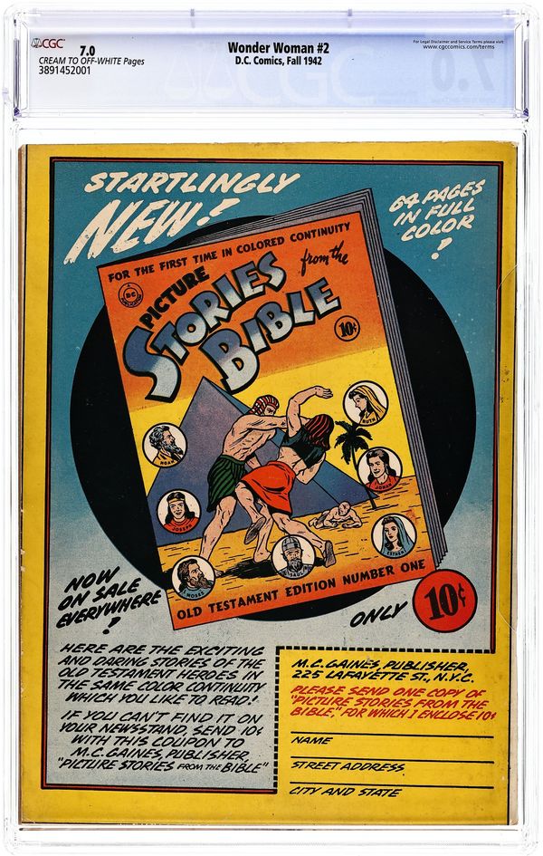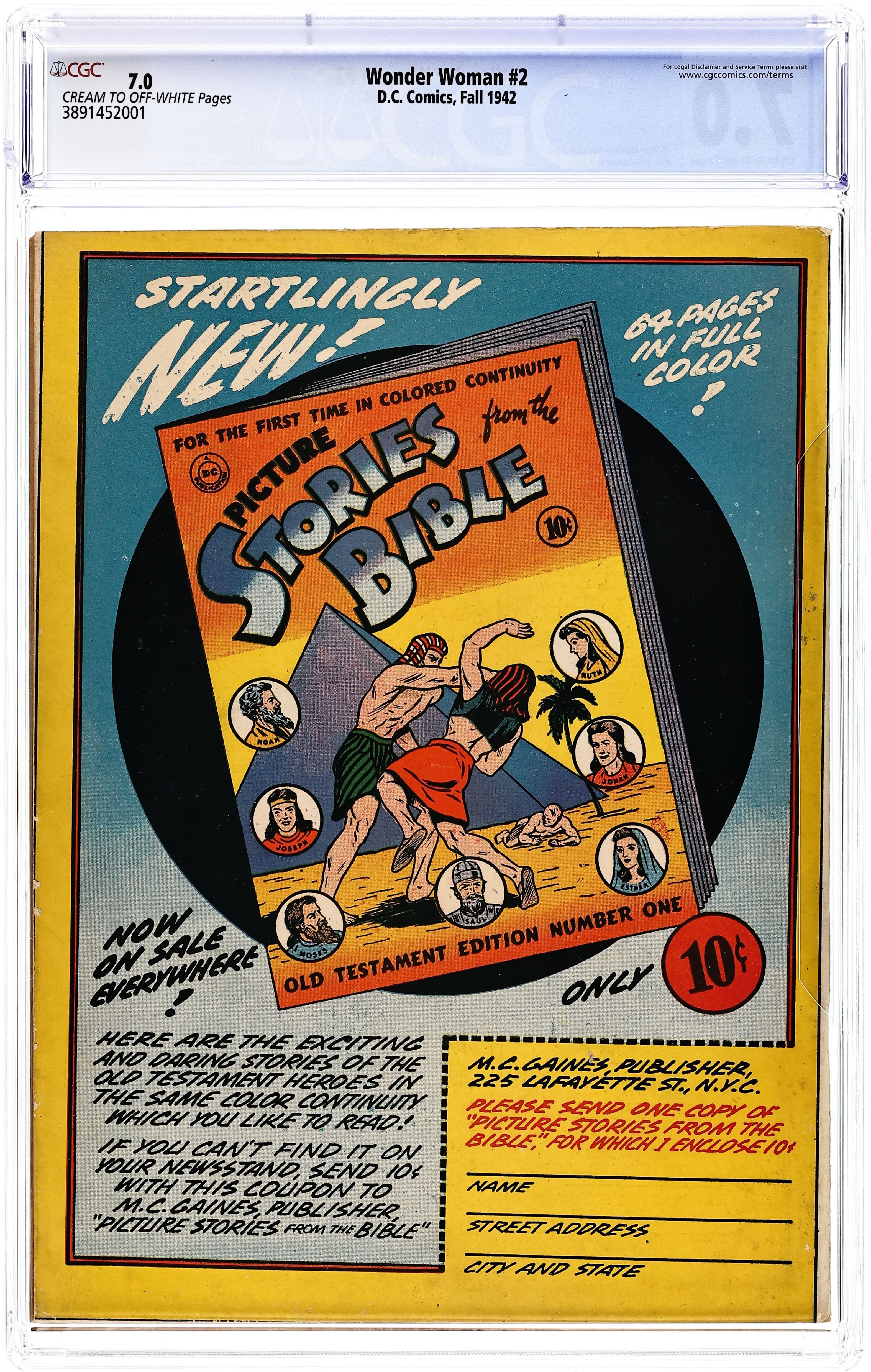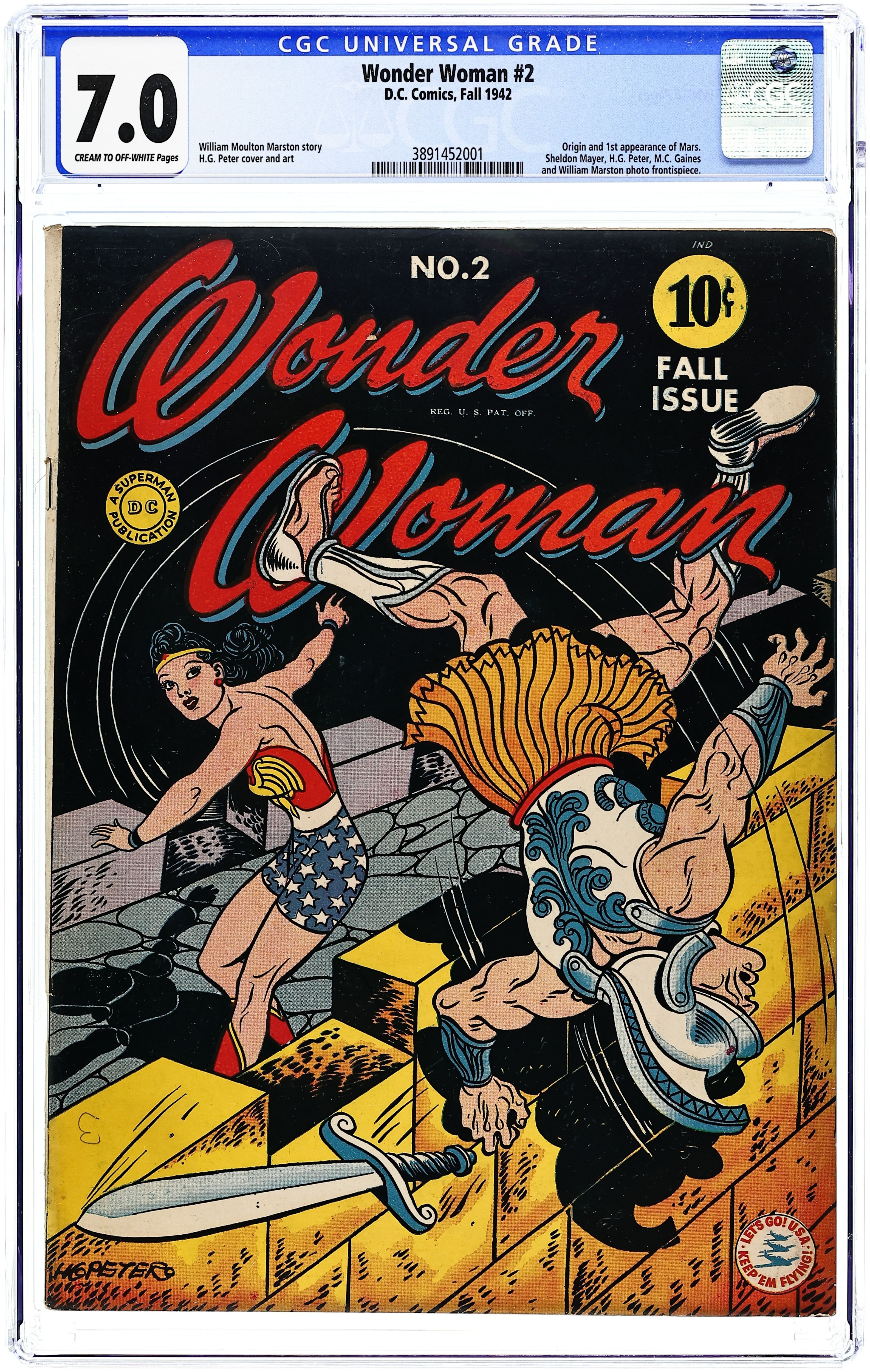 Cover by Harry G. Peter. Dr. Wm. Moulton Marston, H.G. Peter, Sheldon Mayer (editor of Wonder Woman), and M.C. Gaines (DC president) are introduced to the readers on inside front cover, accompanied by a photograph of the 4 men. Untitled story, script by William Moulton Marston (as Charles Moulton), art by Harry G. Peter; Mars kidnaps Steve Trevor to lure Wonder Woman to his home planet, where she secretly participates in the war tournaments while searching for Steve. Untitled story, script by William Moulton Marston (as Charles Moulton), art by Harry G. Peter; Wonder Woman plays baseball to help keep Holliday College open, undermining the Earl of Greed's attempt to use the school as a channel to the U.S. Treasury. Biography of Clara Barton (1821-1912), the "Angel of the Battlefield," who helped establish the Red Cross in America, script by Alice Marble, art by Sheldon Moldoff. Untitled story, script by William Moulton Marston (as Charles Moulton), art by Harry G. Peter; Framed for murder, Wonder Woman is then taken prisoner by the victim, as the Duke of Deception manipulates Hirohito to attack Hawaii. Untitled story, script by William Moulton Marston (as Charles Moulton), art by Harry G. Peter; Using her love of competition, charity, and handsome men against her, Lord Conquest captures Wonder Woman and brings her to Mars a captive slave. Two-page text story, "The Rainmaker" by Jay Marr. Wonder Woman stars in a two-page War Bonds story. 68 Pages, Full Color. Cover price $0.10.