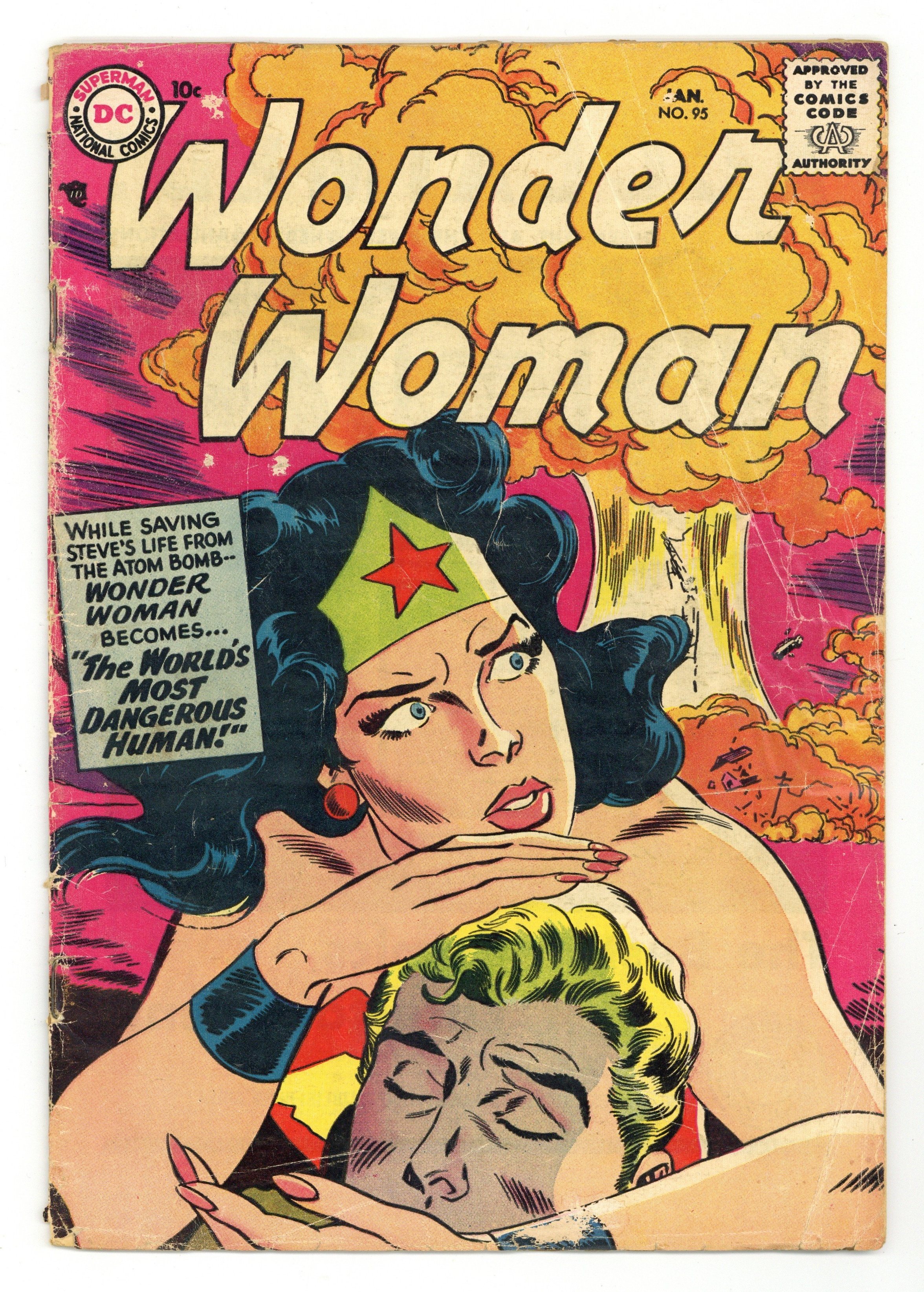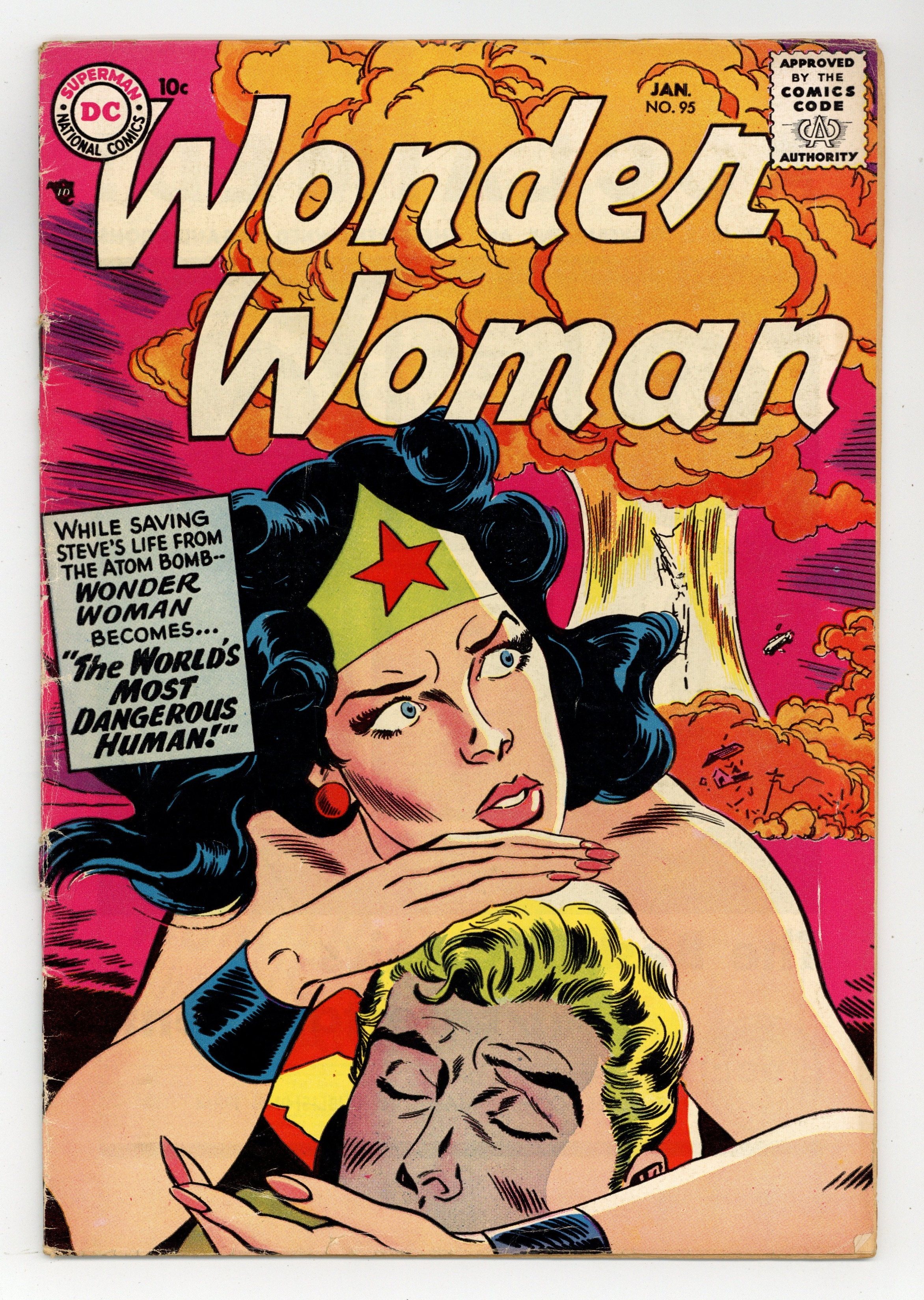 Cover pencils by Ross Andru, inks by Mike Esposito. "Wonder Woman - The World's Most Dangerous Human!", script by Robert Kanigher, art by Harry G. Peter; Wonder Woman becomes radioactive trying to protect Steve from an atomic blast. Ad for comedian comics: Sgt. Bilko; Jerry Lewis; Bob Hope; Jackie Gleason. "The Secret of Wonder Woman's Tiara!", script by Robert Kanigher, art by Harry G. Peter; Wonder Woman receives her tiara as a reward for helping in a battle between two alien races. Peg humor page by Henry Boltinoff. "The Ghost Town Museum!", script by Robert Kanigher, art by Harry G. Peter; Wonder Woman helps a small museum in a dying town find unusual exhibits. 36 pages, Full Color. Cover price $0.10.