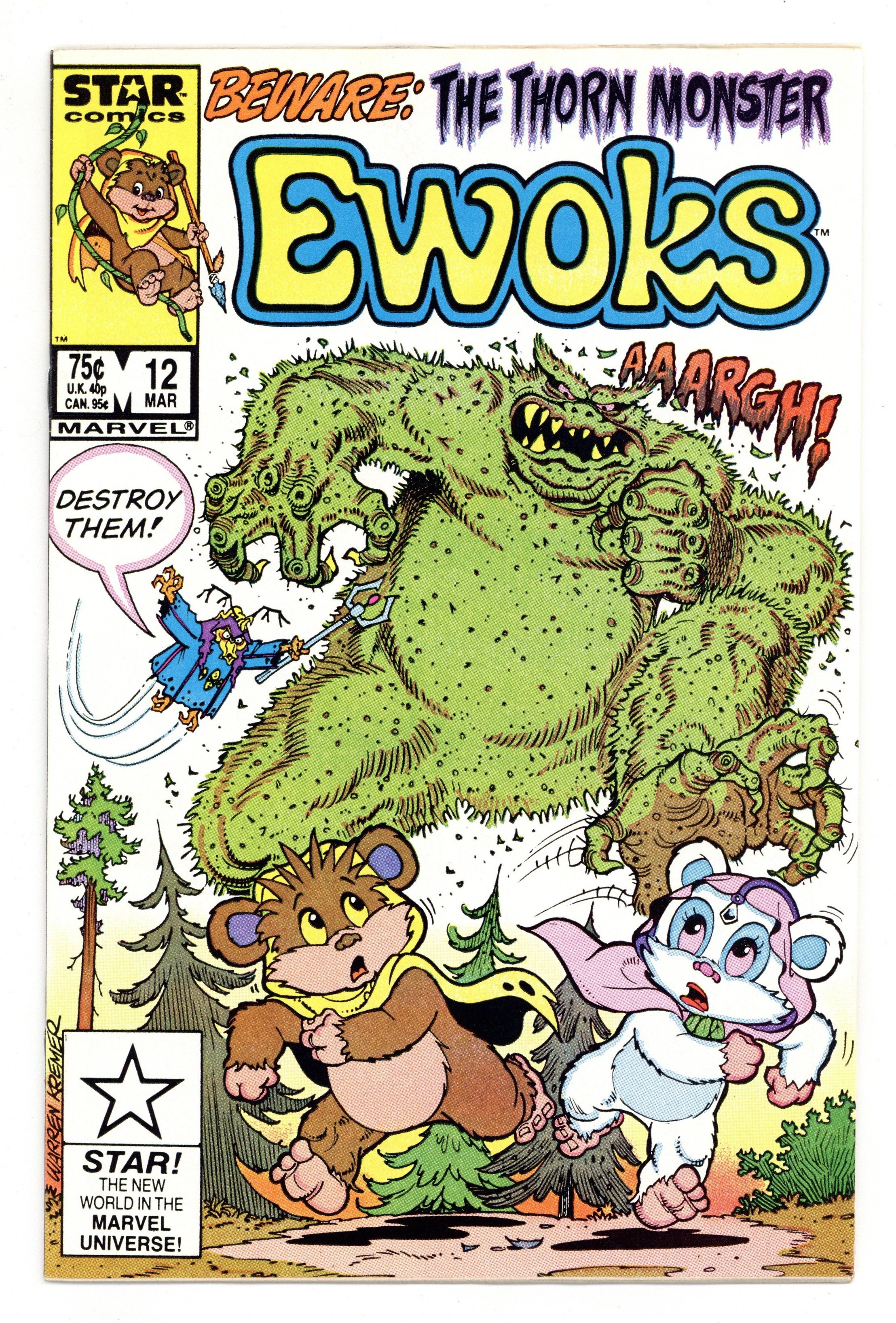 Tags: Star WarsPublished Mar 1987 by Marvel/Star Comics.$19.50The Thorn Monster - Written by Dave Manak. Art by Warren Kremer, Jon D'Agostino and Jacqueline Roettcher. Cover by Warren Kremer. Beware...the Thorn Monster! Characters in this issue: Wicket; Princess Kneesaa; Morag; Logray; Chief Chirpa. 32 pages, full color. Cover price $0.75.