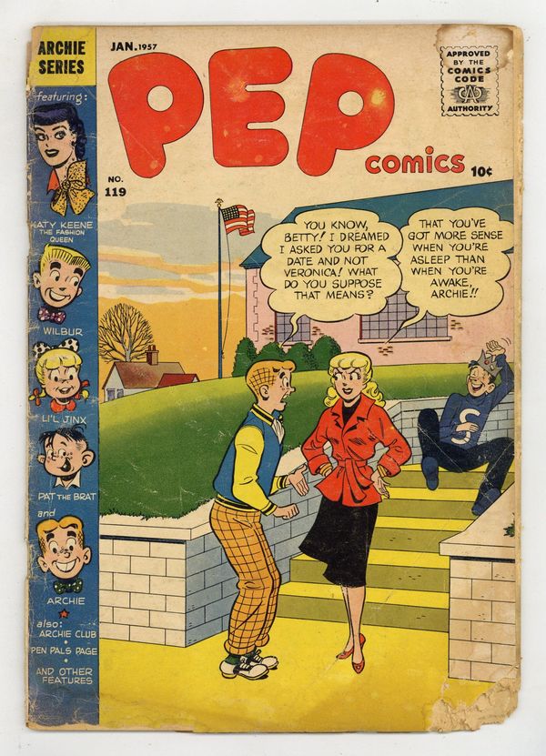 "Arch for Art's Sake," pencils by George Frese, inks by Terry Szenics; Archie gives Veronica a portrait of himself on her birthday. "Lucky Heel"; At the sock hop the girls put their names in numbered socks and place them in a boot; Each boy then draws a sock and that girl is his date for the dance. "Winter Wedding," art by Bill Woggon; Randy asks Katy if she'll marry him and they could have a winter wedding; They starts to imagine what the ceremony would be like before Katy goes to bed. "A Winter Wonderland"; Wilbur dates Linda every night for two weeks; Linda finds out Laurie's been out of town skiing; Thinking that's why she's been getting Wilbur's attention, Linda waits to see if he will keep their date for the following day. Archie Club News. "Fingerprints," script and art by Joe Edwards; Li'l Jinx puts so many fingerprints on the walls of her house, to keep up, her daddy finally gets wallpaper that is decorated with fingerprints. 36 pgs., full color. Cover price $0.10.