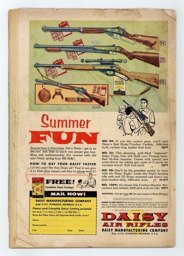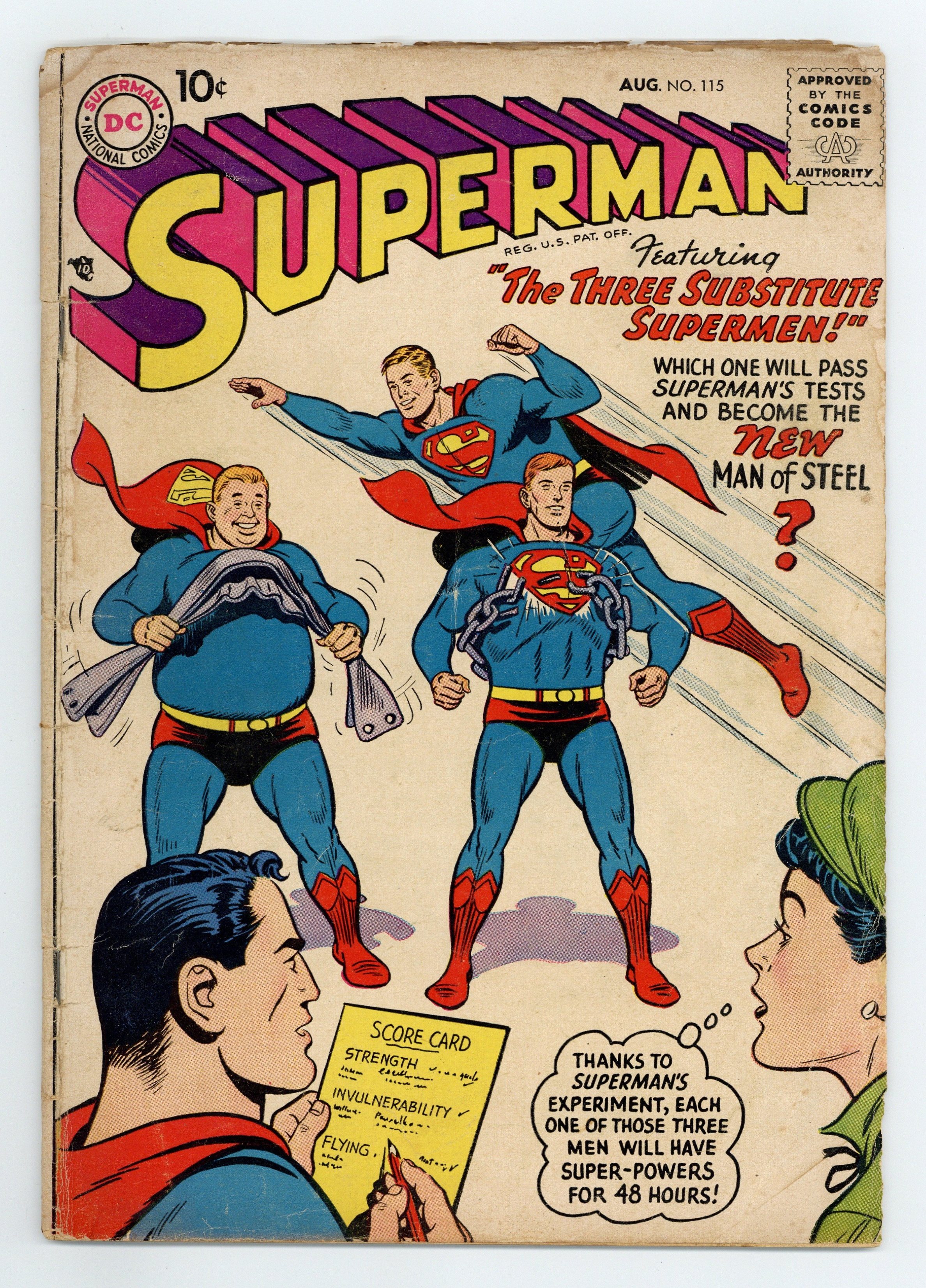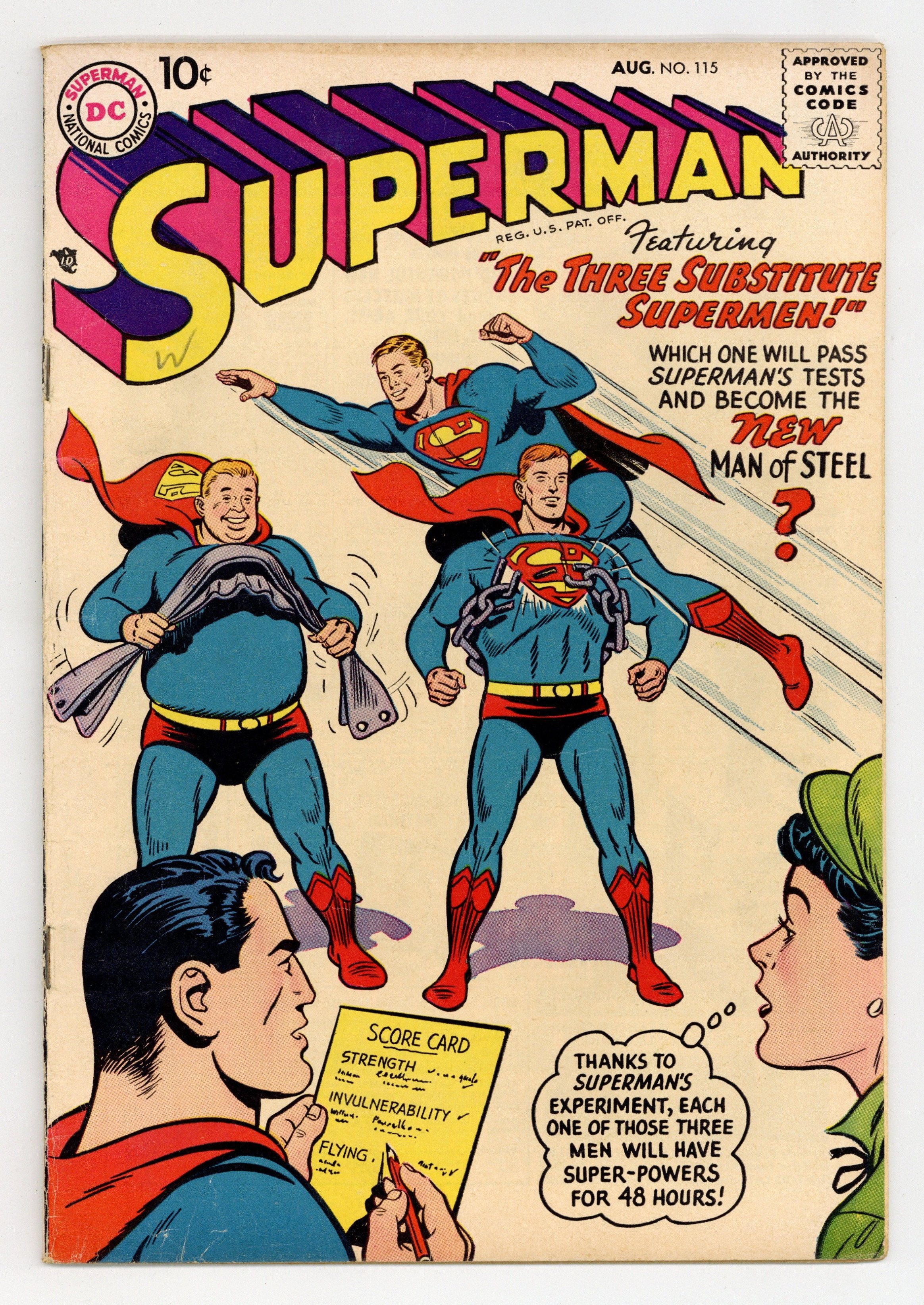 Cover art by Al Plastino. The Midget Superman, script by Otto Binder, pencils by Wayne Boring, inks by Stan Kaye. Jimmy Olsen's Lost Pal starring Superman and Many-Faces Fulton, script by Otto Binder, art by Al Plastino. The Three Substitute Supermen starring Superman and The Organizer, script by Jerry Coleman, pencils by Wayne Boring, inks by Stan Kaye; three potential heroes vie to become the temporary Man of Steel. 36 Pages, Full Color. Cover price $0.10.
