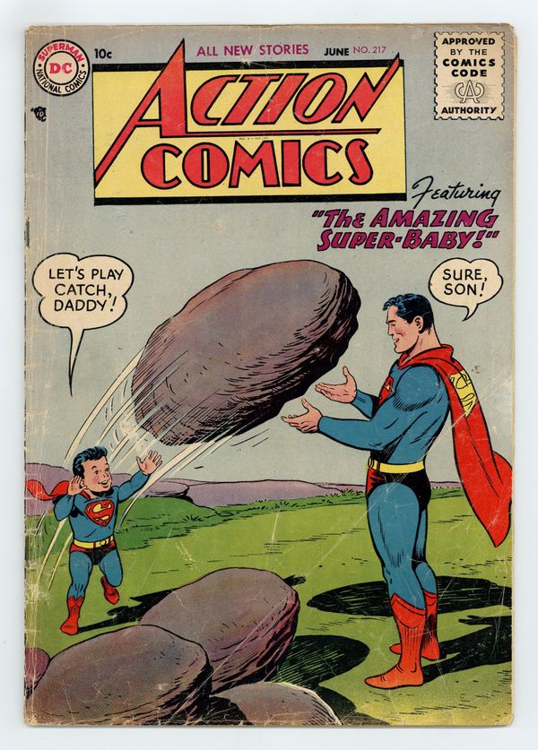 Cover by Al Plastino. "The Amazing Super-Baby," art by Al Plastino; Somebody leaves a baby on Clark Kent's doorstep, who just happens to have super powers. "The One-Man Safari," art by Ed Smalle; Somebody makes a movie about Congo Bill in which he appears to have super-strength, so Bill has to develop super-strength in real life. "Secrets of the Planeteers" starring Tommy Tomorrow, Cosmo Rey, and Cadet Parker, script by Otto Binder, art by Jim Mooney. 36 Pages, Full Color. $.10 Cover price $0.10.