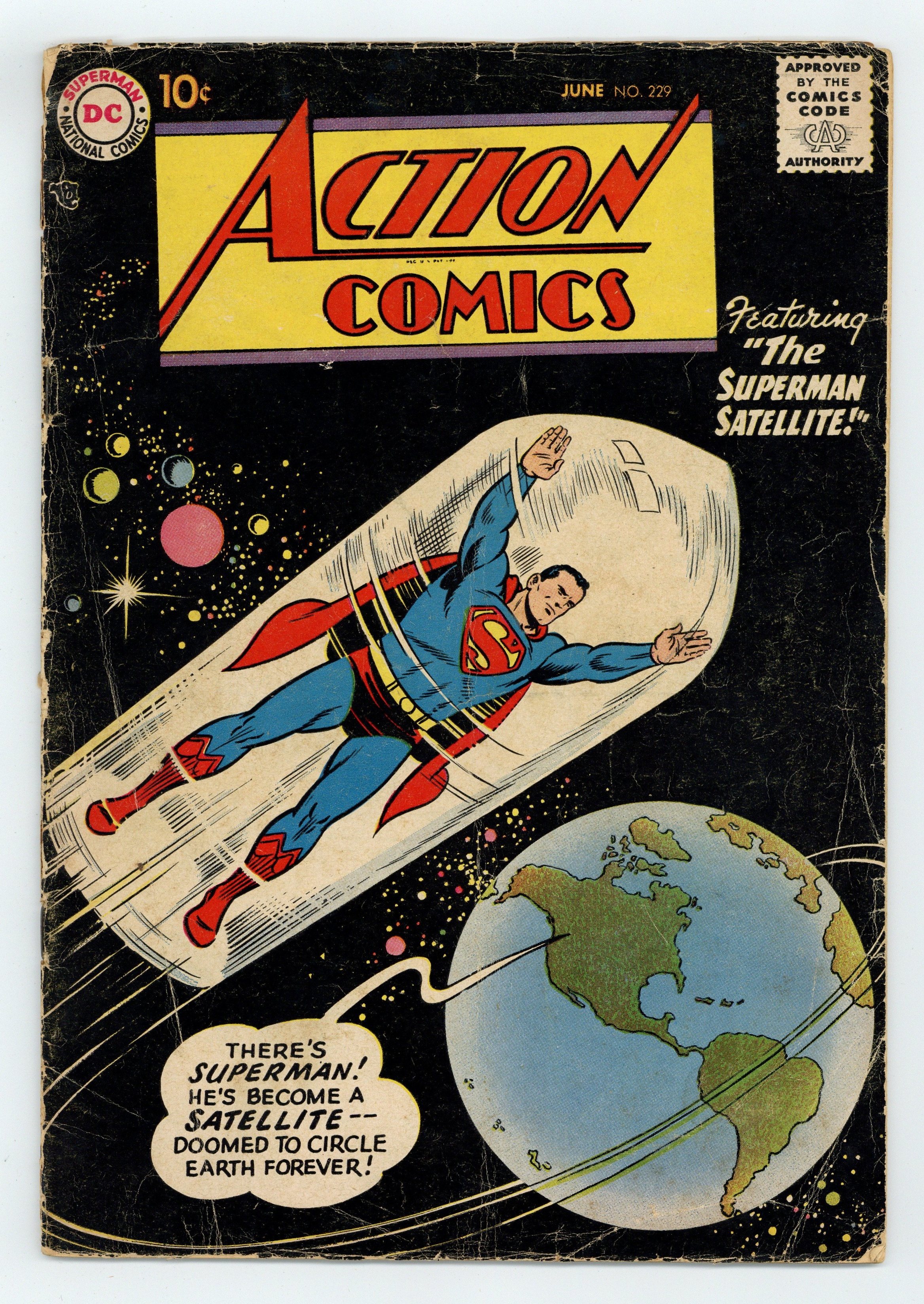 Cover by Al Plastino. "The Superman Satellite," script by Edmond Hamilton, pencils by Wayne Boring, inks by Stan Kaye; After destroying an asteroid in space, Superman is informed that he has become poisonous and that he must never touch the Earth again. "The Great Jungle Swindle" starring Congo Bill and Janu the Jungle Boy, script by Jack Miller, art by Nick Cardy. Half-page Varsity Vic story by Henry Boltinoff. Games That Save Lives article. "The Milky Way Hunt," script by Otto Binder, art by Jim Mooney. 36 Pages, Full Color. $.10 Cover price $0.10.