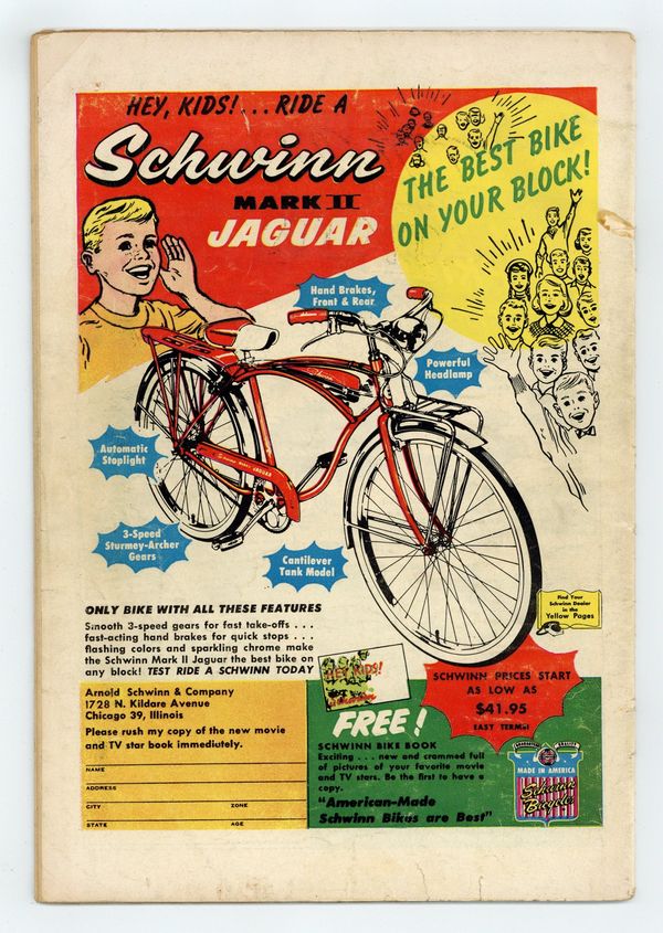 Tags: Superman$110.00Cover pencils by Curt Swan, inks by Stan Kaye. "The Land of A Million Supermen," script by Jerry Coleman, pencils by Wayne Boring, inks by Stan Kaye; When Clark Kent is accidentally stranded in the nation of Borgonia, he discovers that everyone there, including himself, must wear a Superman costume on pain of death... which is a giant trap the dictator of Borgonia has set for the real Superman. "The Jungle Eskimo" starring Congo Bill, art by Howard Sherman. So, You Want to Be an Engineer text story. "The Forbidden Robots," script by Otto Binder, art by Jim Mooney; Tommy and Brent stop the transport of smuggled forbidden robots. 36 Pages, Full Color. $.10 Cover price $0.10.