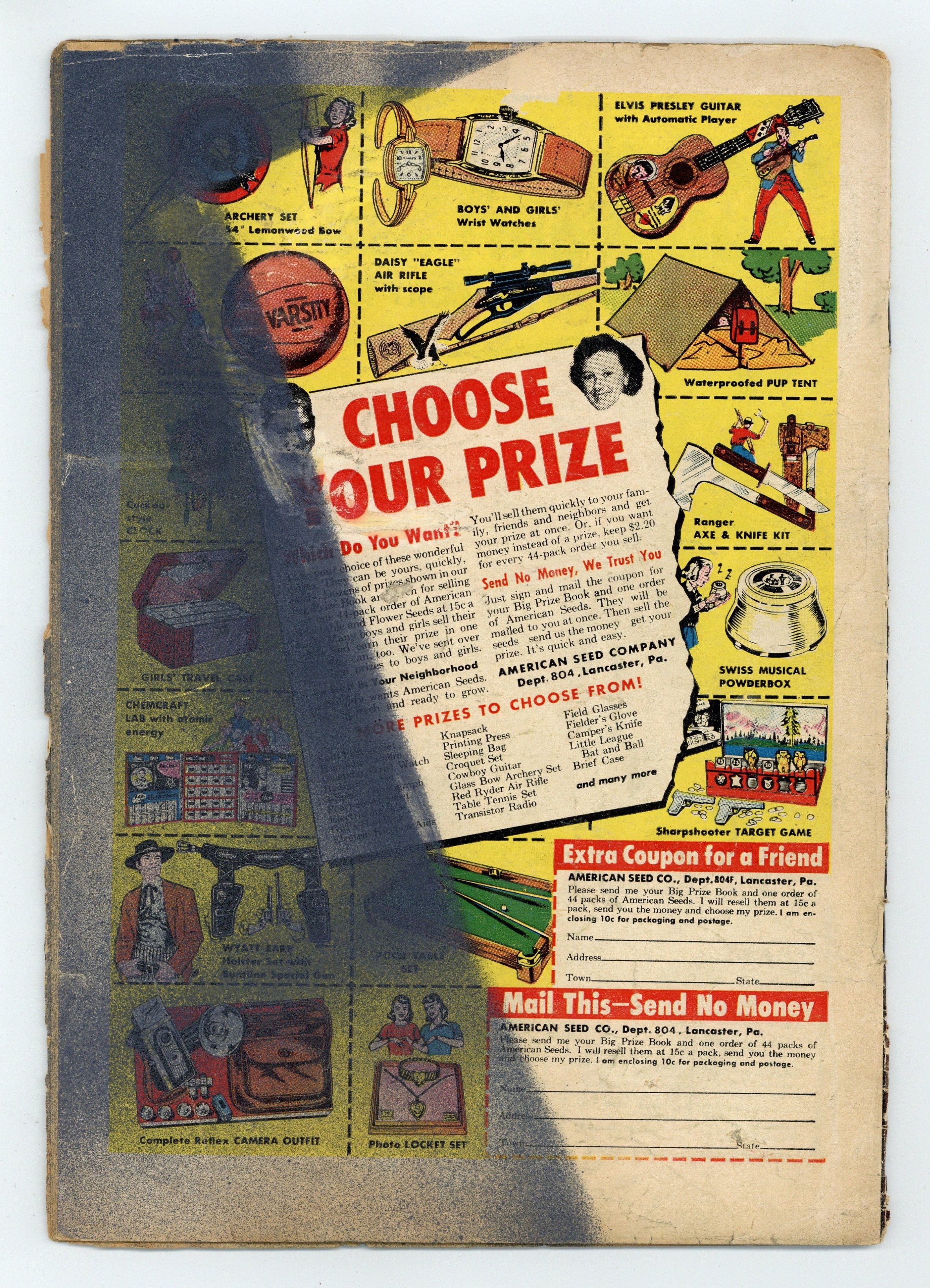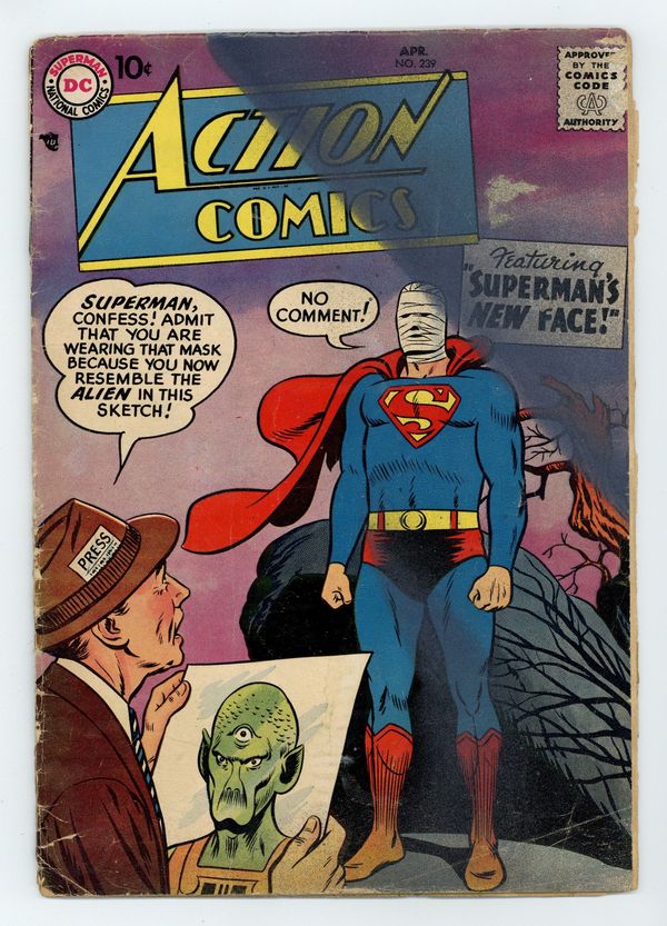 Cover pencils by Curt Swan, inks by Stan Kaye. "Superman's New Face," script by Edmond Hamilton, pencils by Wayne Boring, inks by Stan Kaye; Superman is caught in an atomic explosion and afterwards must bandage his face, or wear a lead mask, to keep anyone from seeing what happened to him. One-page Tricksy the World's Greatest Stunt Man story by Henry Boltinoff. "The Puzzle of the Jungle Pyramid!" starring Congo Bill, art by Howard Sherman. Untitled Jerry the Jitterbug story by Henry Boltinoff. Untitled Casey the Cop story by Henry Boltinoff. "The Toys That Stopped Space Crime" starring Tommy Tomorrow, script by Otto Binder, art by Jim Mooney. 36 Pages, Full Color. $.10 Cover price $0.10.