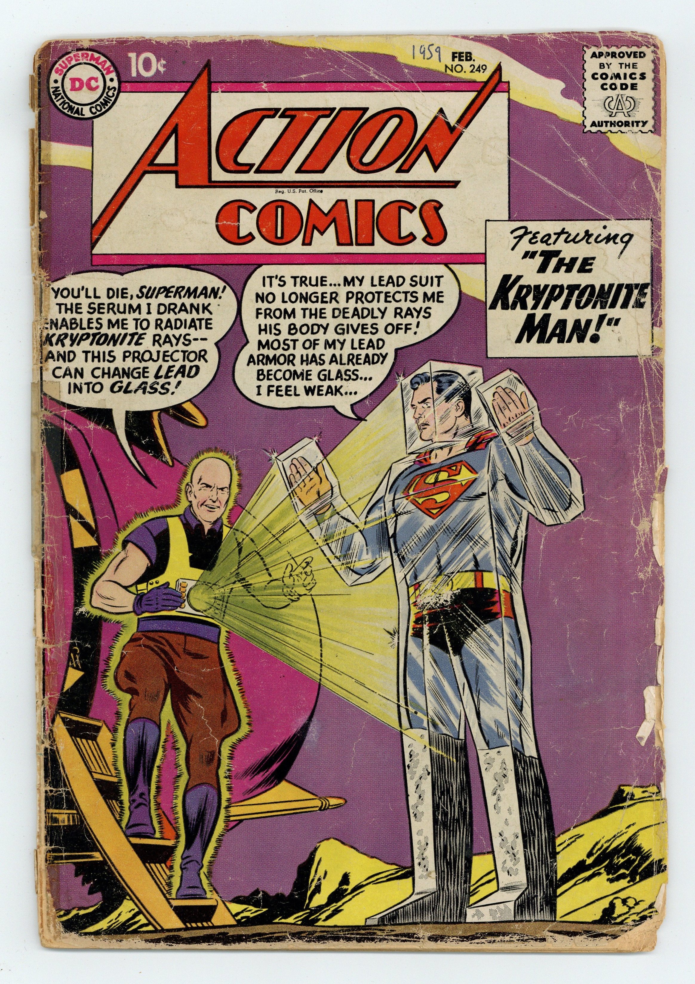 Cover pencils by Curt Swan, inks by Stan Kaye. "The Kryptonite Man!", script by Otto Binder, art by Al Plastino; Luthor takes a liquid kryptonite serum which makes it impossible for Superman to get near him; Superman makes a lead suit to protect himself, but Luthor has discovered a way to turn lead into glass. -page Casey the Cop story by Henry Boltinoff. Supermen of America ad. "The Man-Ape's Mountain Mission," script by Robert Bernstein, art by Howard Sherman; As Congorilla goes on a dangerous mission to rescue some plane crash survivors, the body of Congo Bill is locked in a shack which is about to be blown up. One-page Varsity Vic story by Henry Boltinoff. "The Gambling Asteroid" starring Tommy Tomorrow, script by Otto Binder, art by Jim Mooney. One-page Private Pete story by Henry Boltinoff. 36 Pages, Full Color. $.10 Cover price $0.10.