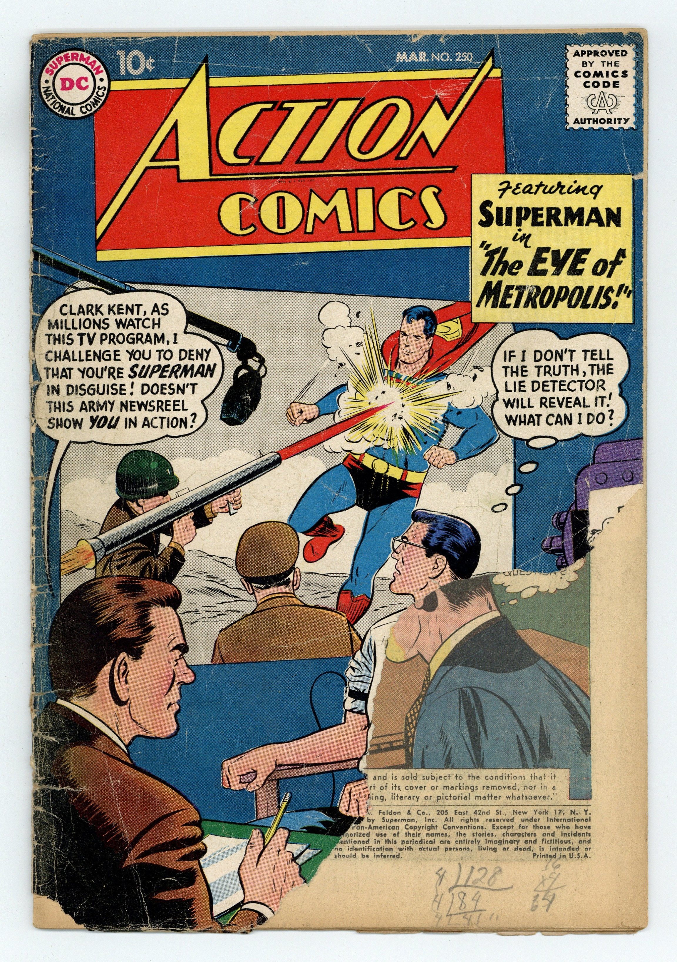 Cover pencils by Curt Swan, inks by Al Plastino. "The Eye of Metropolis!", script by Bill Finger, pencils by Wayne Boring, inks by Stan Kaye; John Bates has Clark Kent appear on his TV show "The Eye of Metropolis" in order to expose his double life as Superman. "The Boy Planeteer" starring Tommy Tomorrow, script by Otto Binder, art by Jim Mooney; 5 1/2 year old Dikky Hale joins the Planeteers and demonstrate a "sixth sense," knowing when disasters are going to strike before the Planeteers do; But Tommy quickly realizes Dikky is not who he appears. Superman of America ad. "The Dunce of the Jungle" starring Congorilla, art by Howard Sherman. 36 Pages, Full Color. $.10 Cover price $0.10.