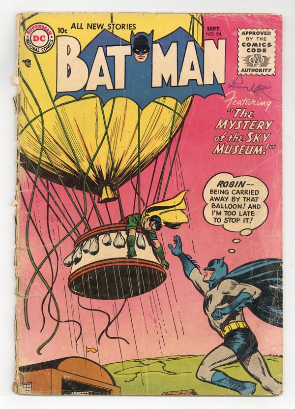 Cover by Win Mortimer. "The Sign of the Bat!", pencils by Sheldon Moldoff, inks by Charles Paris; Unable to get the evidence he needs to convict hoodlum Marstin, Batman devises a plan to make sure that Marstin and his gang see the famed but dreaded bat symbol each time they try to commit a crime…a plan which eventually allows the Caped Crusaders to nab the felon. Is Pike's Peak (14,110 ft. elevation) Quick Quiz by H. T. Elmo. "The New Batman!", pencils by Sheldon Moldoff, inks by Stan Kaye; While cleaning up the Bat-Cave one day, Alfred is accidently struck on the head; He awakens, believing that he is the Batman, and he dresses for the role. Half-page Casey the Cop story by Henry Boltinoff. 2/3-page Hollywood Ha-lights story by Harry Lampert. "Booby-Traps for Burglars" text story by Jack Miller. "Mystery of the Sky Museum!", script by Edmond Hamilton, pencils by Sheldon Moldoff (as Bob Kane), inks by Charles Paris; The Dynamic Duo fly out to the famed Sky Museum to talk with the curator about a problem he has been having and they find the man struggling to keep an old air relic in the sky; The mystery deepens when a series of attempts on Batman and Robin's lives occur using vintage aircraft against them! 36 Pages, Full Color. Cover price $0.10.