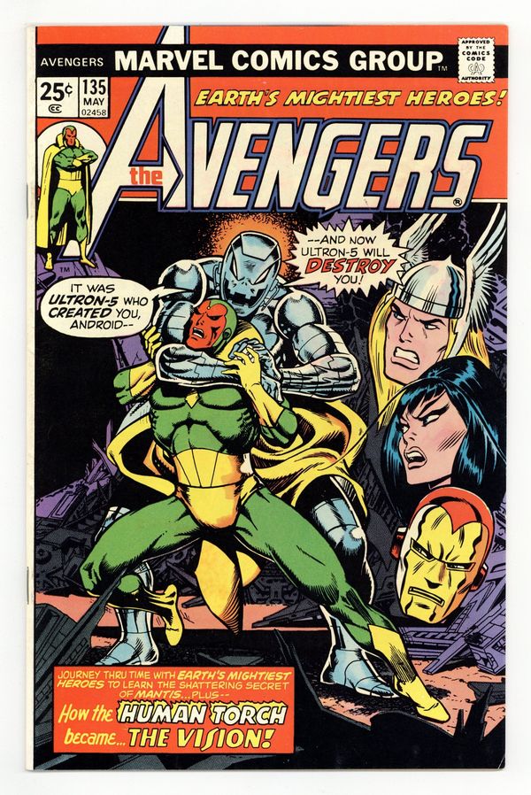 "The Torch is Passed!" Script by Steve Englehart. Pencils by George Tuska. Inks by Frank Chiaramonte. Cover by Jim Starlin and John Romita Sr. (vignettes). In the Mad Thinker's deserted laboratory, the Vision witnesses how Ultron-5 transformed the original Human Torch's body into his own synthetic body. Sadly, the synthezoid avenger also observes the tragic death of his creator and his first valiant fight against Ultron. However, the past is in the past; and knowing the truth, the Vision is ready to move forward and reunite with Earth's Mightiest Heroes! Meanwhile in present day Vietnam, Moondragon joins Mantis, Hawkeye, Iron Man, Thor, Libra, and the Cotati to uncover the secrets of the Celestial Madonna. Origin of the Vision. Origin of Moondragon. Death of Dr. Phineas T. Horton. Story continues in Giant-Size Avengers 4. Cameo appearance by Immortus. Flashback cameos by the Wasp, Henry Pym, Dr. Phineas T. Horton, Quasimodo, Silver Surfer, Thanos, Mentor, and the Mad Thinker. (Notes: This issue fills in the details of what took place between Fantastic Four Annual 4 and the Vision's first appearance in Avengers 57. Elements of the story in Doctor Strange (2nd series) 7 continue in Giant-Size Avengers 4.) The letters page contains a statement of ownership: average print run 342,917; average paid circulation 188,084. 36 pgs. Cover price $0.25.