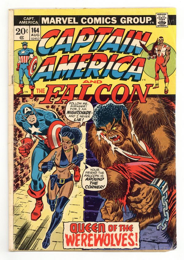 First appearance of Nightshade in "Queen of the Werewolves" Plot by Steve Englehart and Alan Weiss. Script by Steve Englehart. Art by Alan Weiss (with touch-ups by John Romita Sr.). Cover by John Romita Sr. On their way back to New York, the Sentinel of Liberty and the Falcon stop at Grimrock Prison in Maryland to check on Sam Wilson's friend who is serving time there. And unfortunately, the duo is completely unaware of the horror that awaits them inside. Cap enters the facility from the rear and is immediately attacked by werewolves! The star-spangled avenger ferociously fends off the wolf pack and then meets their master: Nightshade! She initially seems harmless -- almost childlike -- but Nightshade enjoys turning people into werewolves...including Sam Wilson! Oh no, will Captain America have to fight the new Falcon-Wolf? Yes, he will. Just like Nightshade planned! Cameo appearances by Nick Fury and the Yellow Claw. (Notes: This is the first appearance of Yellow Claw since the early silver age Yellow Claw (1956) series. A robot version of the character appeared in Strange Tales (1st series) 161-167. Nightshade returns in Captain America 189. Years later she will turn Cap into a werewolf in Captain America 405. Romita's touch-ups to Weiss' pencils create quite a contrast in styles.) 36 pages. Cover price $0.20.
