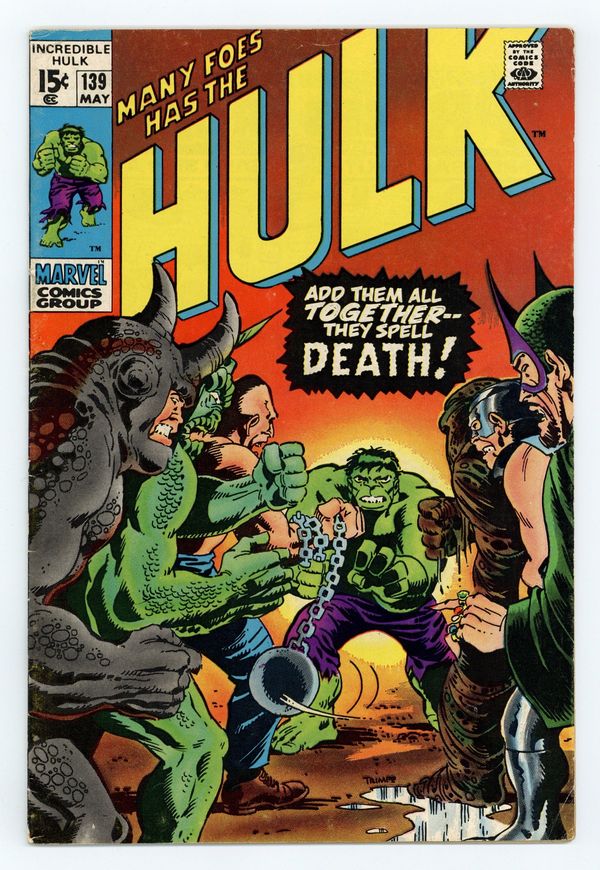 Tags: Marvel Legacy Numbering: Hulk (part 139), Hulk$25.99Cover art by Herb Trimpe. Many Foes Has the Hulk!, script by Roy Thomas, pencils by Herb Trimpe, inks by Sam Grainger; The Leader uses a mental enhancing machine to throw all of Hulk's enemies at him on the same day hoping to give the Green Goliath a heart attack. The story continues in part in Avengers 88. (The Abomination is featured on the cover but does not appear in the story.) 36 pgs. $0.15. Cover price $0.15.