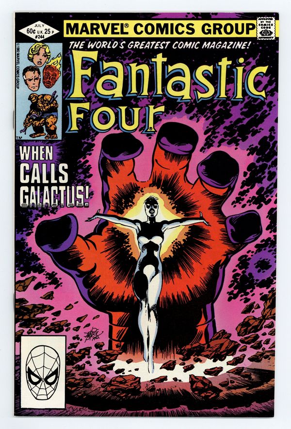 Starts Feb 2 Direct Edition. "Beginnings and Endings" Part 3 of 3. Script and Art by John Byrne. Cover by John Byrne. After an unprecedented victory over Galactus, the Avengers and the Fantastic Four face a major ethical decision: should they try to save the Ravager of Worlds or let him perish as his energies dwindle? Reed decides on the former and constructs a giant machine to revitalize Galactus! However, the Devourer of Worlds needs one more thing to complete his recovery...a new herald! In a stunning move, Frankie Raye volunteers! So where does that leave the Human Torch? First appearance of Nova (aka Frankie Raye). Cameo appearances by Captain America, Iron Man, Thor, Wasp, and Doctor Strange. (Notes: This trilogy was reprinted in 1989 in the trade paperback titled "Fantastic Four: Trial of Galactus." Reed's decision to save Galactus will come back to haunt the FF beginning in Fantastic Four 257.) 36 pages Cover price $0.60.
