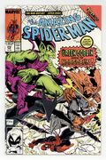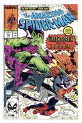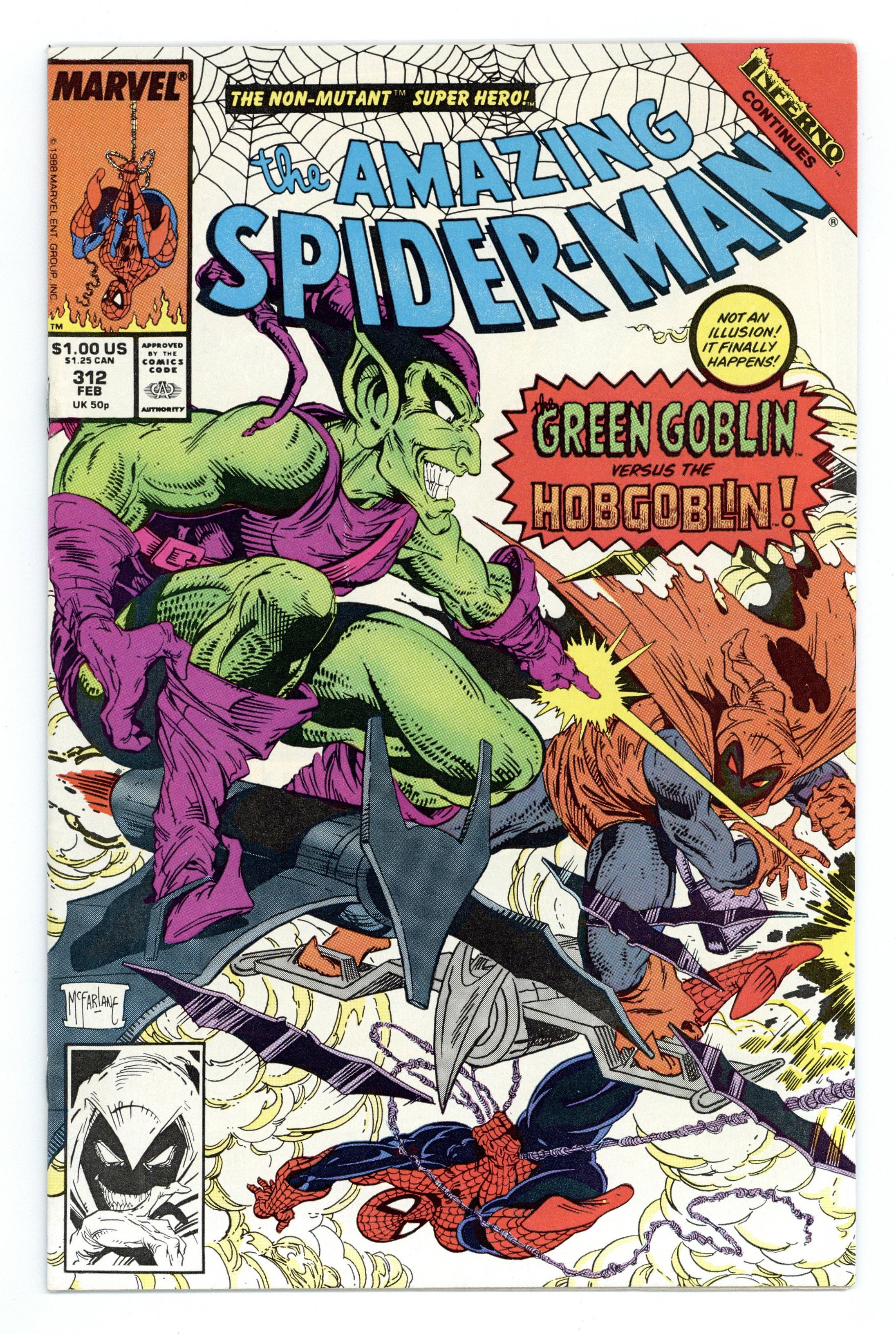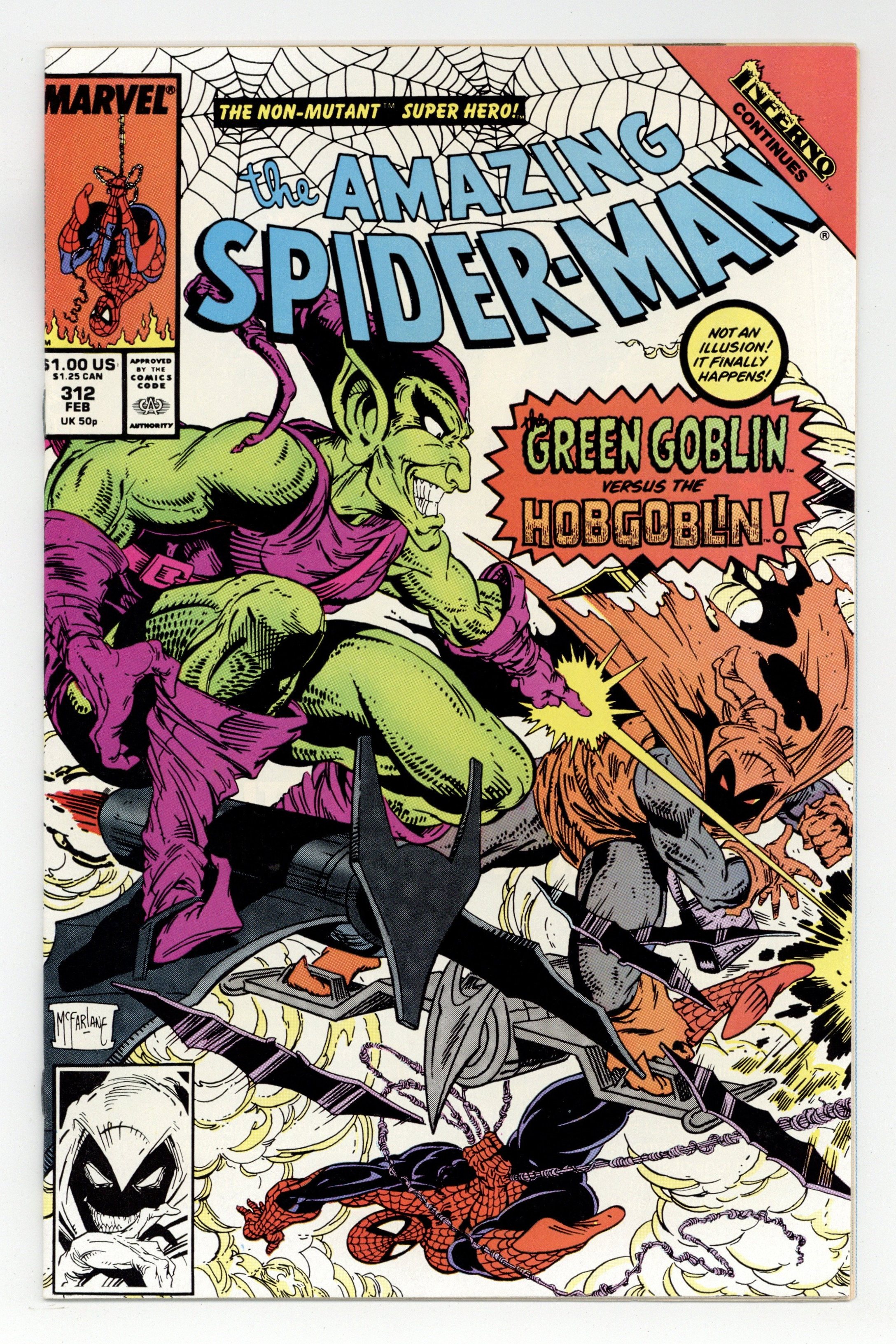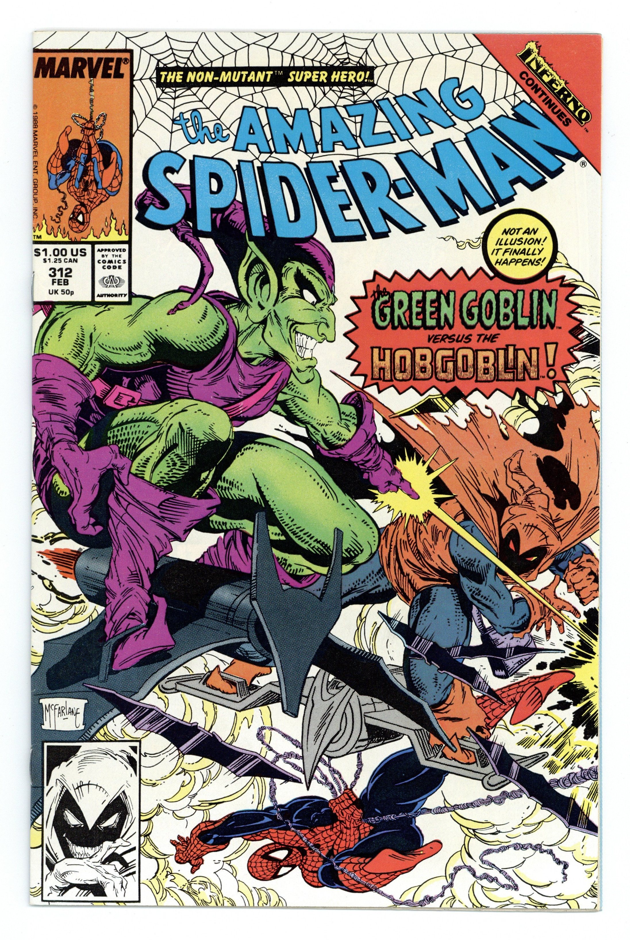 Tags: Inferno (part 11), Marvel Legacy Numbering: Amazing Spider-Man (part 312)$35.50Direct Edition. "The Goblin War!" Inferno crossover. Script by David Michelinie. Art by Todd McFarlane. Cover by Todd McFarlane. Story continues from Web of Spider-Man 47. With his family in danger, the Green Goblin rides again! Oh my, does Harry know what he's doing by challenging the might of the Hobgoblin? In the skies above the Osborn Chemical Company, the pumpkin bombs fly as the goblins clash! And naturally your friendly neighborhood Spider-Man is caught in the middle! Meanwhile the effects of Inferno begin affecting Dr. Curt Connors. Uh-oh, could an appearance from the Lethal Lizard be in the near future? Yesss! Story continues in Spectacular Spider-Man 147. Cameo appearances by Mary Jane Watson, Liz Osborn, and J. Jonah Jameson. (Note: Harry Osborn dons the garb of the Green Goblin for the first time since Amazing Spider-Man 180.) 36 pgs. Cover price $1.00.