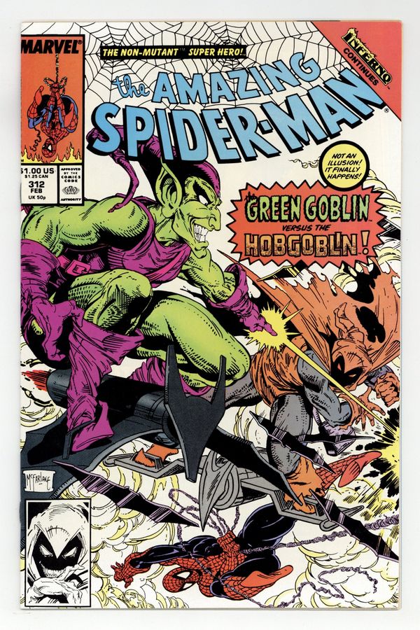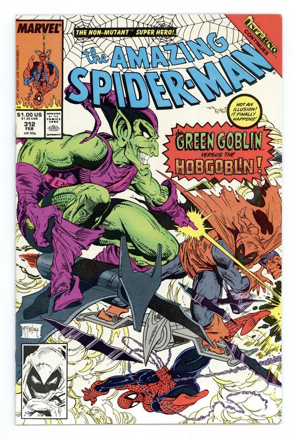 Tags: Inferno (part 11), Marvel Legacy Numbering: Amazing Spider-Man (part 312)$19.00Direct Edition. "The Goblin War!" Inferno crossover. Script by David Michelinie. Art by Todd McFarlane. Cover by Todd McFarlane. Story continues from Web of Spider-Man 47. With his family in danger, the Green Goblin rides again! Oh my, does Harry know what he's doing by challenging the might of the Hobgoblin? In the skies above the Osborn Chemical Company, the pumpkin bombs fly as the goblins clash! And naturally your friendly neighborhood Spider-Man is caught in the middle! Meanwhile the effects of Inferno begin affecting Dr. Curt Connors. Uh-oh, could an appearance from the Lethal Lizard be in the near future? Yesss! Story continues in Spectacular Spider-Man 147. Cameo appearances by Mary Jane Watson, Liz Osborn, and J. Jonah Jameson. (Note: Harry Osborn dons the garb of the Green Goblin for the first time since Amazing Spider-Man 180.) 36 pgs. Cover price $1.00.