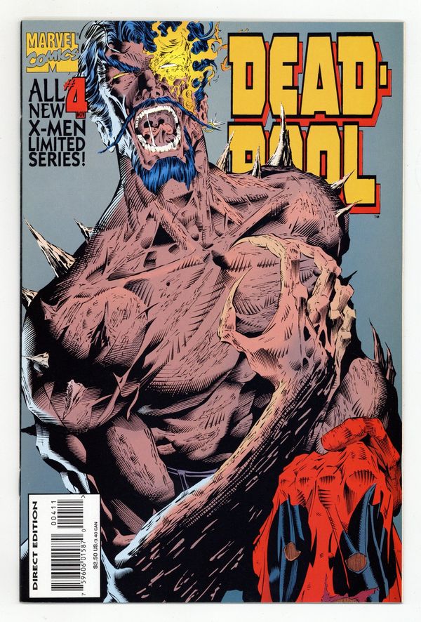 Direct Edition. Cover pencils by Ian Churchill, inks by Bud LaRosa. Mano a Mano, script by Mark Waid, pencils by Ian Churchill and Ken Lashley, inks by Bud LaRosa, Tom Wegrzyn, Philip Moy, and W. C. Carani; DP, Siryn and Banshee battle Juggernaut and Black Tom, who has been fitted with Pool's severed hand; As Killebrew's solution to Tom's condition takes a turn for the worse, the heroes and villains cease hostilities as Black Tom is taken in for medical help by Banshee; Deadpool makes off with Killebrew, the man who created him for Weapon X, so the good doctor can find out why his healing factor is failing. Cover price $2.50.