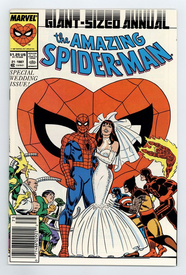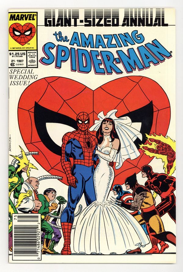 Newsstand Edition. The marriage of Peter Parker and Mary Jane Watson in "The Wedding." Plot by Jim Shooter. Script by David Michelinie. Pencils by Paul Ryan. Inks by Vince Colletta. Cover by John Romita Sr. Newsstand Edition. At long last wedding bells ring for Peter Parker and Mary Jane Watson! What an exciting day! The blushing bride will need something old, something new, something borrowed, and something blue! While the Amazing Spider-Man will need to take care of two things before the big day! First, the easy task...short circuit Electro's latest scheme! And second, the tough one...put the memory and heartache of Gwen Stacy in the past forever. Will another trip to the Brooklyn Bridge bring peace to the wondrous wall-crawler? Or will the ghosts of days gone by derail a bright future with Mary Jane? Carpe diem, web-slinger! Appearances by Flash Thompson, Harry Osborn, Liz Osborn, Betty Leeds, Aunt May, Anna Watson, Joe Robertson, J. Jonah Jameson, and Willi Smith. Flashback cameos by the Green Goblin, Gwen Stacy, and Uncle Ben. (Notes: Peter and Mary Jane go on their honeymoon in Spectacular Spider-Man Annual 7. The Direct Edition cover features Peter Parker's friends and family. The Newsstand Edition depicts Spider-Man's friends and foes. Amazing Spider-Man Annual 21 was one of the first issues Marvel published with two different covers. This story was reprinted in the 1991 trade paperback: the Amazing Spider-Man - The Wedding.) 52 pages. Cover price $1.25.