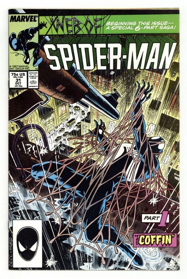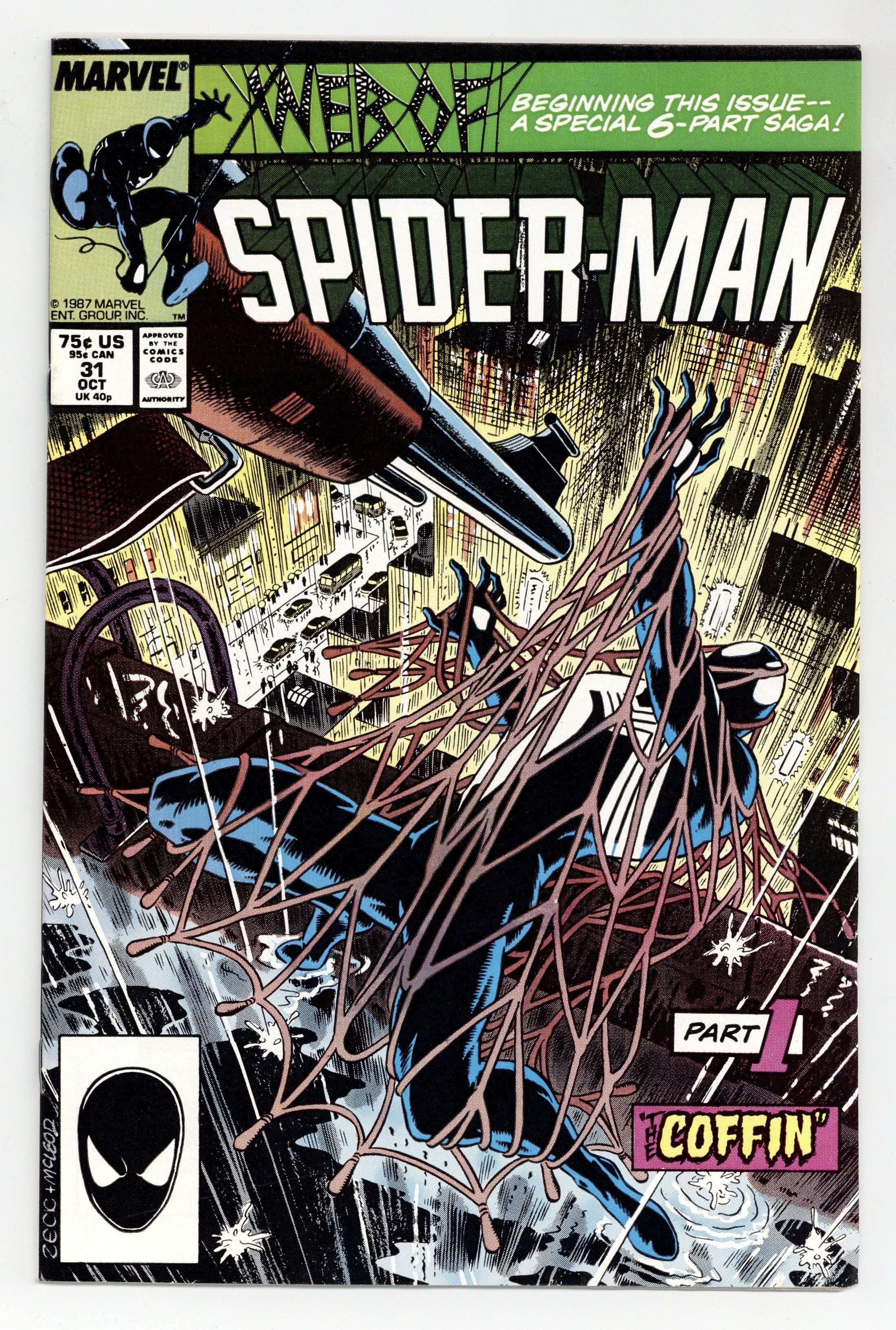 Direct Edition. Kraven's Last Hunt - Part 1 of 6 - "The Coffin" Story by J. M. DeMatteis. Art by Mike Zeck and Bob McLeod. This is the first issue of the Kraven's Last Hunt storyline. A deranged Kraven begins his final quest to exterminate Spider-Man. He ambushes the web-slinger and successfully captures him. Now it appears that a comatose Spider-Man has been buried alive. The situation does not look good. Story continues in Amazing Spiderman 293. 32 pages Cover price $0.75.