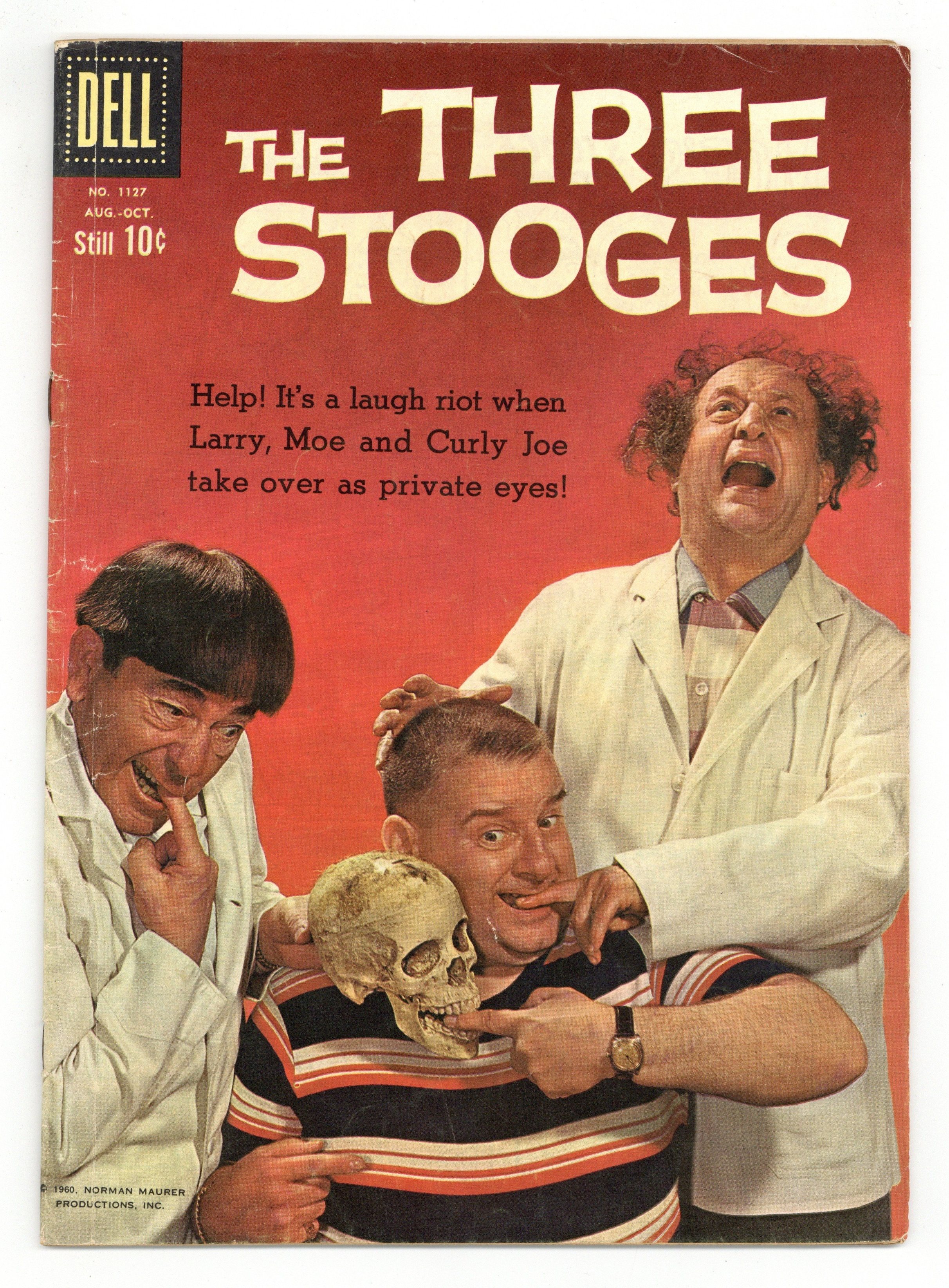 $11.00Indicia title is "THE THREE STOOGES, No. 1127." Cover photo of The Three Stooges: Moe Howard, Larry Fine, and Curly Joe deRita. The Private Eye-Balls; The Stooges become detectives to try to recover a woman's pearl necklace. Beach Boo-Boobs; The Stooges get jobs as lifeguards at a beach. Scripts by Carl Fallberg, pencils by Pete Alvarado, inks by Tony DiPaola. 36 pages, full color. Cover price $0.10.