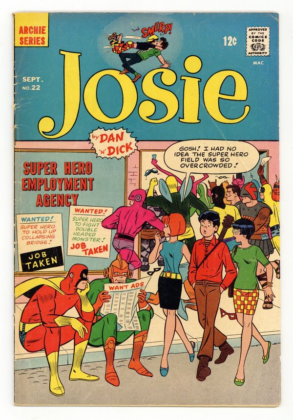 Tags: ArchiePublished Sep 1966 by Archie Publications.$13.50Cover pencils by Dan DeCarlo. The Mudslinger; Alex takes up Super-heroing as Mighty Man. With Alexandra as Mighty Girl, they seek out a non-existant villain they call the Mudslinger (who is actually a pranksting Pepper with Melody). Dressed to Kill, script by Frank Doyle, pencils by Dan DeCarlo; Everyone mocks the girls' latest groovy '60s fashions, except Alex. Frost Free, script by Frank Doyle, pencils by Dan DeCarlo, inks by Vincent DeCarlo; Alexandra kidnaps Albert and takes him to her "underground man-trap." Josie pinup, pencils by Dan DeCarlo. Nuts humor page with Li'l Jinx by Joe Edwards. 36 pgs. $0.12. Cover price $0.12.