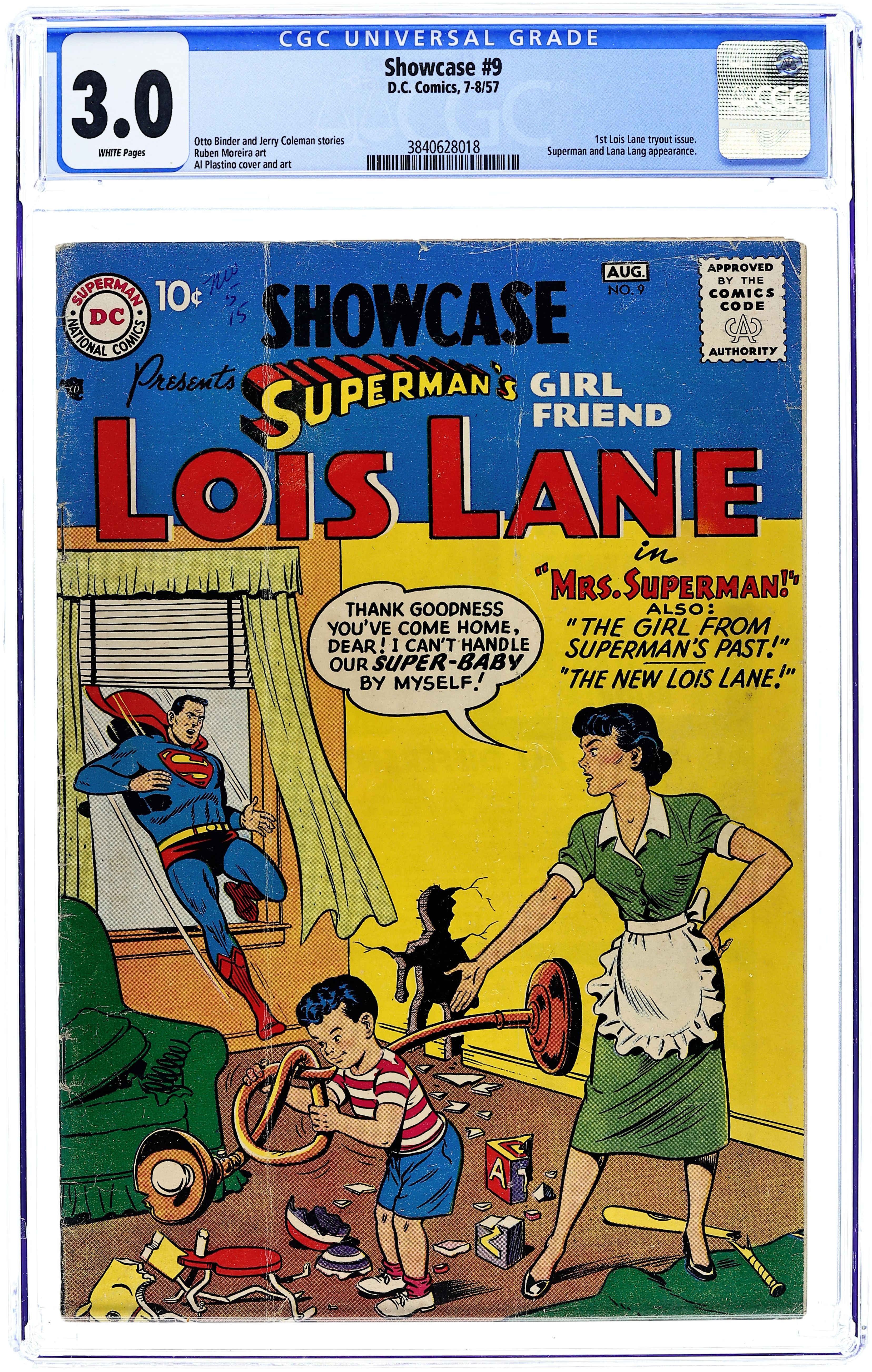 Cover art by Al Plastino. The Girl in Superman's Past, script by Jerry Coleman, art by Al Plastino; Lois meets Lana Lang for the first time, and the girls immediately compete to see whom Superman likes better, but Superman refuses to fall into their traps. The New Lois Lane, script by Otto Binder, pencils by Ruben Moreira, inks by Al Plastino; Superman hopes that Lois' constant snooping to find his identity will provide evidence to convince "Con" Conners that he is wrong in believing that Clark Kent is Superman. Sleuths In Skirts article. Mrs Superman, script by Otto Binder, art by Al Plastino; Lois dreams she's married to Superman. 36 Pages, Full Color. Cover price $0.10.