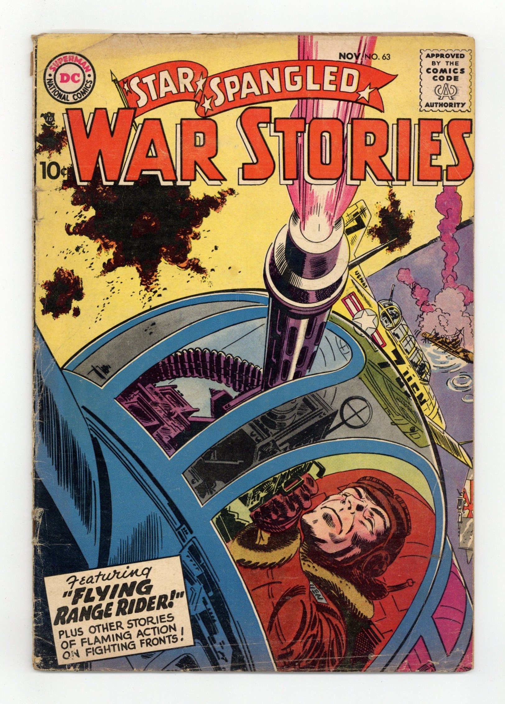 Cover art by Jerry Grandenetti. Flying Range Rider, script by Robert Kanigher, art by Jerry Grandenetti. Set Up a Line, script by Bill Finger, art by Jack Abel. It Can't Get Rougher, script by Bill Finger, art by Irv Novick. The Monkey Wrench, script by France Herron, pencils by Ross Andru, inks by Mike Esposito. Khaki-Yaks humor half-page by Irwin Hansen. First in War, script and pencils by Morris Waldinger, inks by Tom Nicolisi. 36 Pages, Full Color. Cover price $0.10.