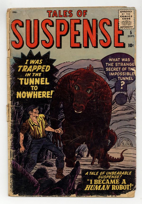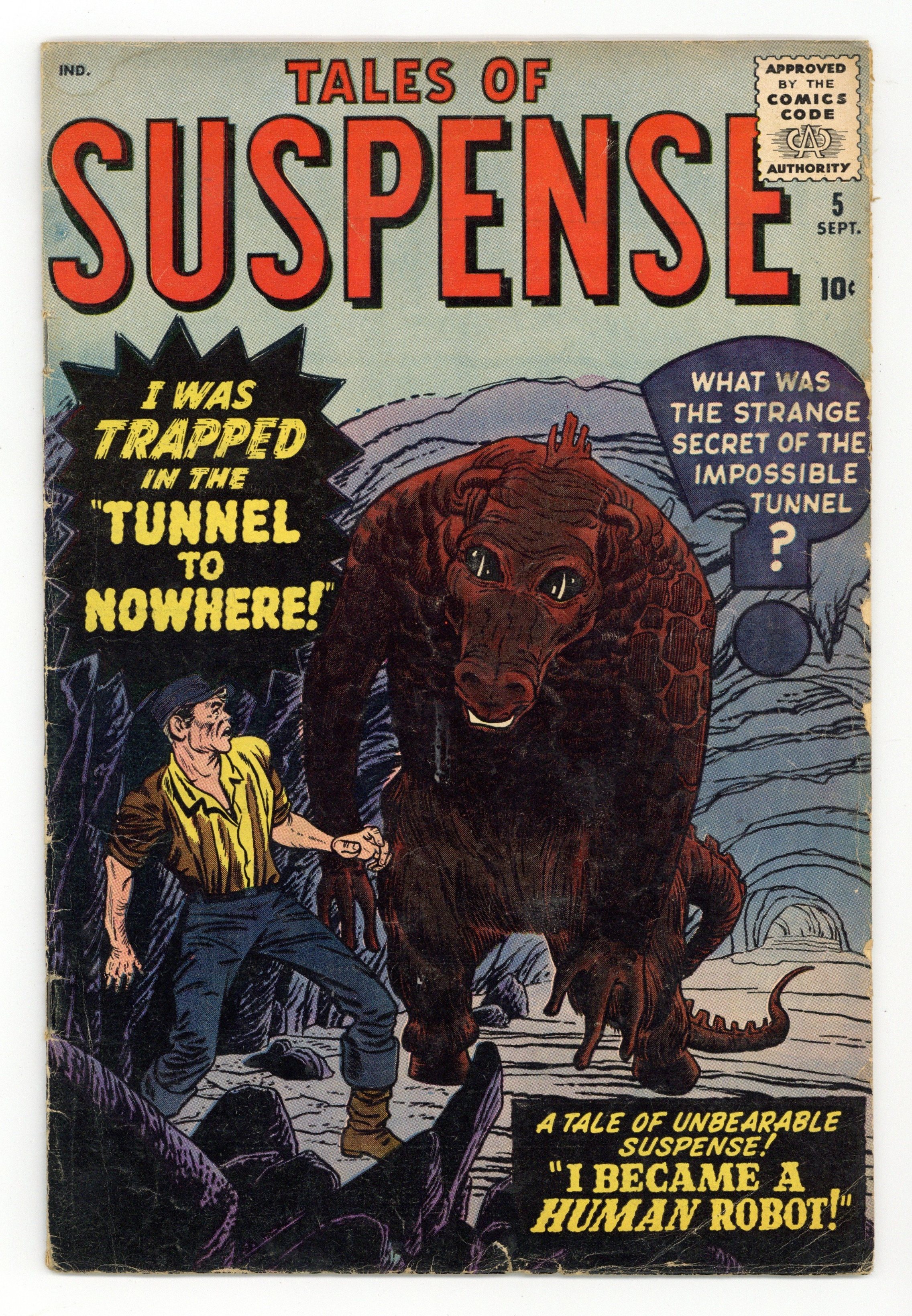 Cover pencils by Jack Kirby, inks by Chris Rule. "I Became a Human Robot!", art by Joe Sinnott; An alien spy places his mind in a robot sent to Earth, hoping to be taken in for study; He gains access to data on Earth technology, but the scientists turn his robot body off, trapping him. "The Masterpiece" text story. "I Fought the Tyrannosaurus," art by Steve Ditko; A couple vacationing in Africa find a dinosaur egg that hatches a live tyrannosaur; The dinosaur terrifies the villagers, but eventually dies in a landslide. "I Walk Thru Walls!", art by Paul Reinman; A criminal accidentally makes a teleporter and uses it to commit incredible burglaries, until a clever cop sets a trap for him. "I Traveled Thru Time!!", art by Carl Burgos; A foreign spy escapes capture by using a time machine to flee to the 18th century, but finds that he has assumed the identity of Benedict Arnold and will be executed in his place. "I Was Trapped in the Tunnel to Nowhere!", art by John Forte; An engineer attempts to build a tunnel from America to Europe but it is destroyed by inhuman creatures living in an undersea city. 36 pages, full color. Cover price $0.10.